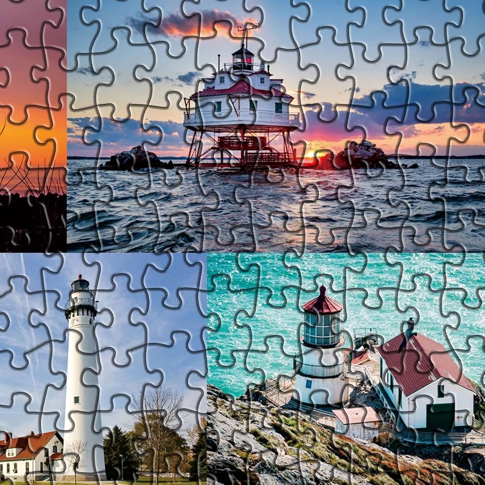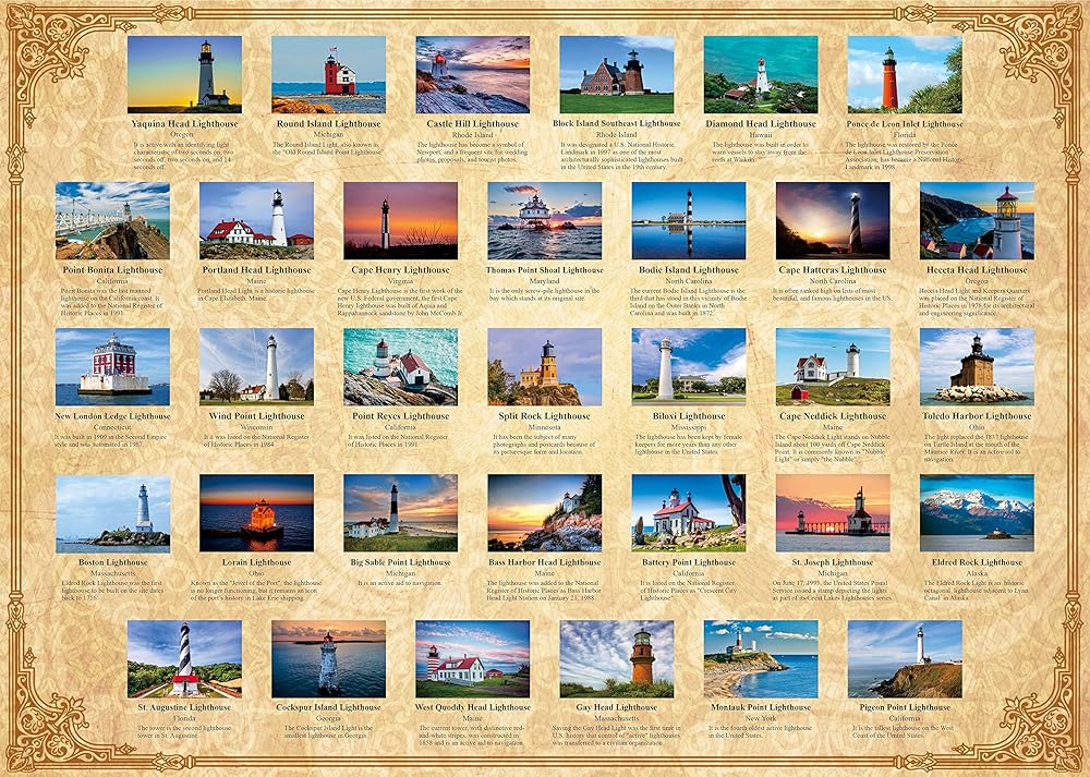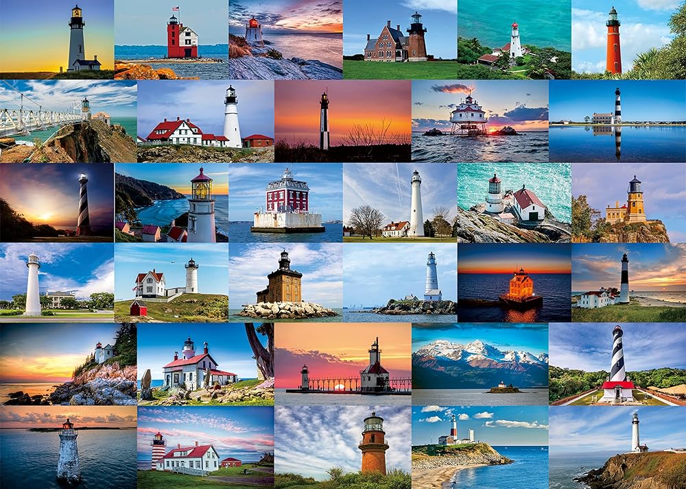 【قيمة التجميع】 قد لا تكون المنارات جانبًا ملحوظًا جدًا من وسائل النقل الحديثة، ولكنها كانت ضرورية للسلامة والملاحة. إذا كنت من محبي المنارة، فتأكد من زيارة أجمل المنارات في الولايات المتحدة الأمريكية! تجمع أحجية الصور المقطوعة المكونة من 1000 قطعة 33 من أجمل المنارات في الولايات المتحدة لقائمة الدلو الخاصة بك.