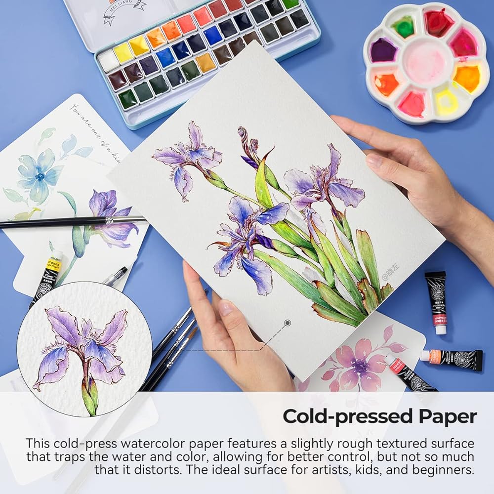 • قطعتان من ورق الألوان المائية المضغوط على البارد من القطن بنسبة 100% بجودة الفنانين: ورق ألوان مائية بوزن 140 باوند (300 غرام لكل متر مربع)، 40 ورقة. مصنوع من القطن بنسبة 100%، وهو خالٍ من الأحماض ومصمم ليدوم طويلاً، مثالي للمبتدئين والخبراء.