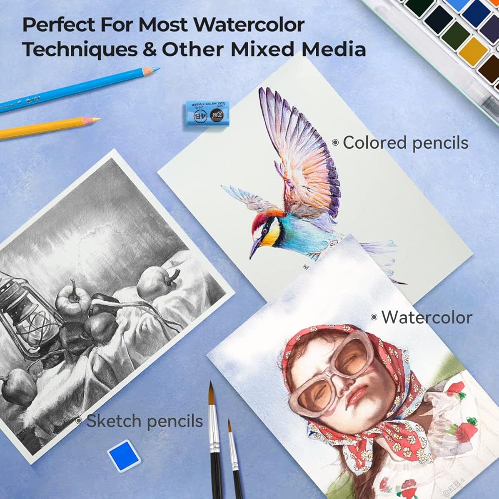 • خالٍ من الأحماض ومصمم ليتحمل: ورق الألوان المائية بوزن 140 باوند بوزن 330 غرام لكل متر مربع ثقيل الوزن وسميك يمنع النزيف والتجعد. مصنوعة من لب القطن بنسبة 100%، وهي خالية من الأحماض ومصممة لتدوم طويلاً، مثالية للمبتدئين والخبراء، لن تصبح صفراء أو هشة بمرور الوقت. مثالية للمبتدئين والخبراء، لن تصبح صفراء وهشة بمرور الوقت.