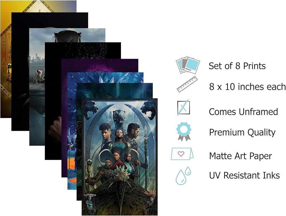 امتلك هذه المجموعة الفريدة من نوعها المكونة من ثمانية - ملصقات ترويجية مقاس 8 × 10 من بلاك بانثر واكاندا فوريفر -- المطبوعات لا تأتي في إطار. ------------------------------------------------------------------------------ بيج ويج برينتس هو بائع الصور الأفضل على أمازون...صور ومطبوعات بجودة احترافية بأسعار رائعة