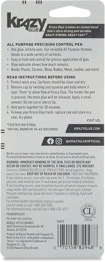 تركيبة Krazy Glue لجميع الأغراض هي الغراء الفائق المثالي للإصلاحات والمشروعات اليومية! ثق بها لربط الأدوات المنزلية مثل البلاستيك والسيراميك والخشب والمطاط والمعادن والجلود والمزيد. يحتوي قلم التحكم الدقيق على مقابض ضغط تتحكم في تدفق الغراء لتقليل الفوضى على يديك، بينما توفر أداة التطبيق قطرة واحدة في كل مرة للحصول على إصلاحات دقيقة. غطاء مانع للتسرب يمنع الغراء الفائق من الجفاف. وأخيرا، يظهر مؤشر الغراء مقدار ما تبقى.