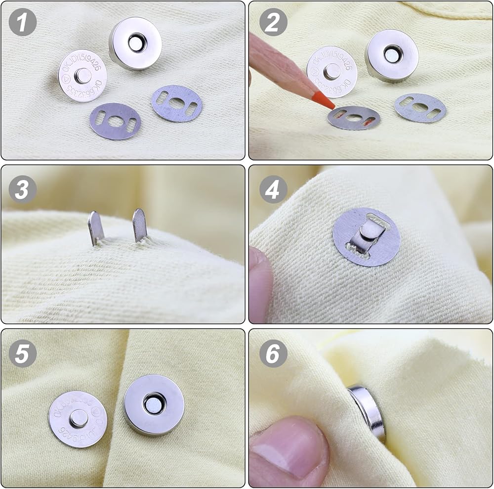 * لا توجد حاجة لأي أدوات، ما عليك سوى إدخال الشوكات من خلال القماش/المادة ثم طيها. يتكون الزر المغناطيسي من جزأين. بمجرد وضع اللقطتين في مكانهما، سيتم ربطهما معًا عند تقريبهما من بعضهما البعض. سهلة الخياطة ومريحة في الاستخدام.