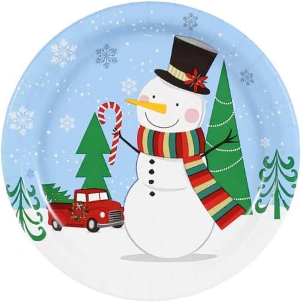 36 قطعة - أطباق ورقية لرجال الثلج مقاس 8 3/4 بوصة - مشهد غابة شتوية لرجل ثلج مبتسم في المقدمة يحمل قصب حلوى. توجد شاحنة حمراء بها شجرة عيد الميلاد في الجزء الخلفي من الشاحنة.