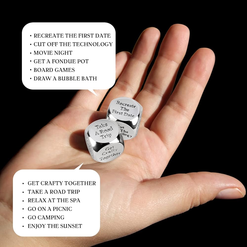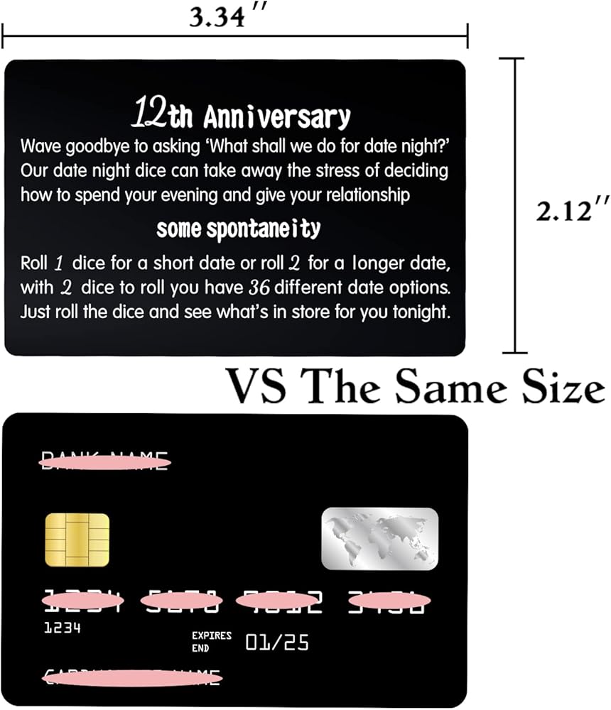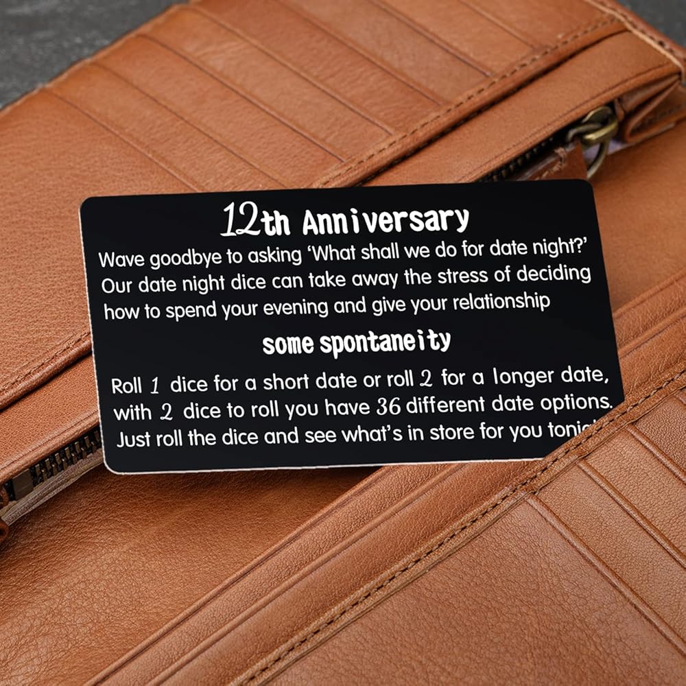 • 12 Years Anniversary Gifts for Him: Let's the 12th Wedding Anniversary Dice to decide your Twelve Years Anniversary Date Night Idea, 12th Anniversary Dice is also come alongs with Twelve Anniversary Gifts Metal Instruction Card. A funny 12th Anniversary Gifts for Couple to celebrate 12 Anniversary. 12th Anniversary Gift is a perfect 12 Anniversary Gifts for Her, Twelve Years Wedding Anniversary Gifts, 12th Wedding Anniversary or 12th Anniversary Gift for Husband