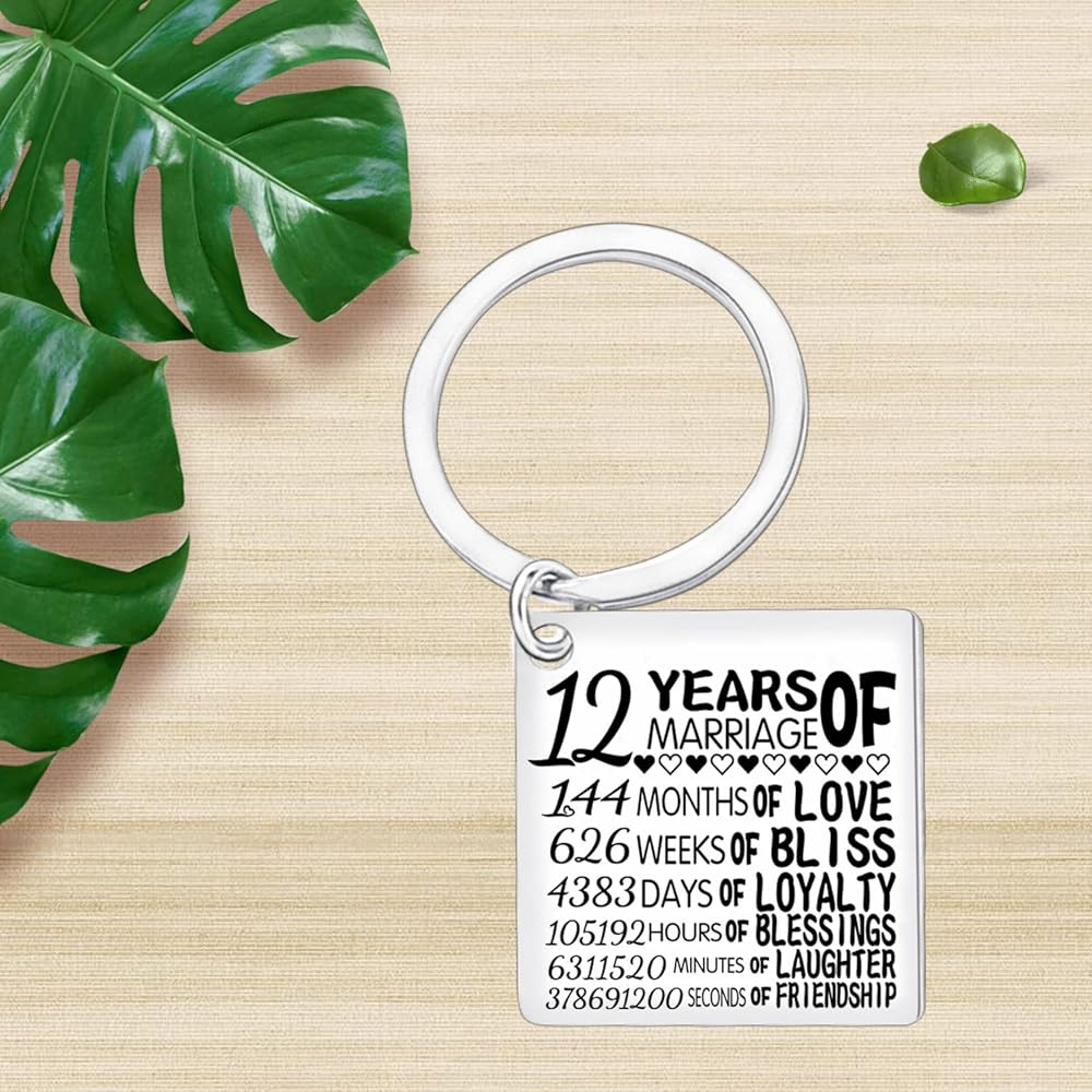 • 12th Anniversary Gifts for Husband: Our 12th Anniversary Gifts for Couple also contain 12 Year Marriage Keychain engraved with sweetest dates of 12 Years of Marriage. A perfect 12th Anniversary Gifts for Her, 12 Years Anniversary Gifts for Husband, Twelve Anniversary Gifts for Boyfriend or 12th Wedding Anniversary for Couple
