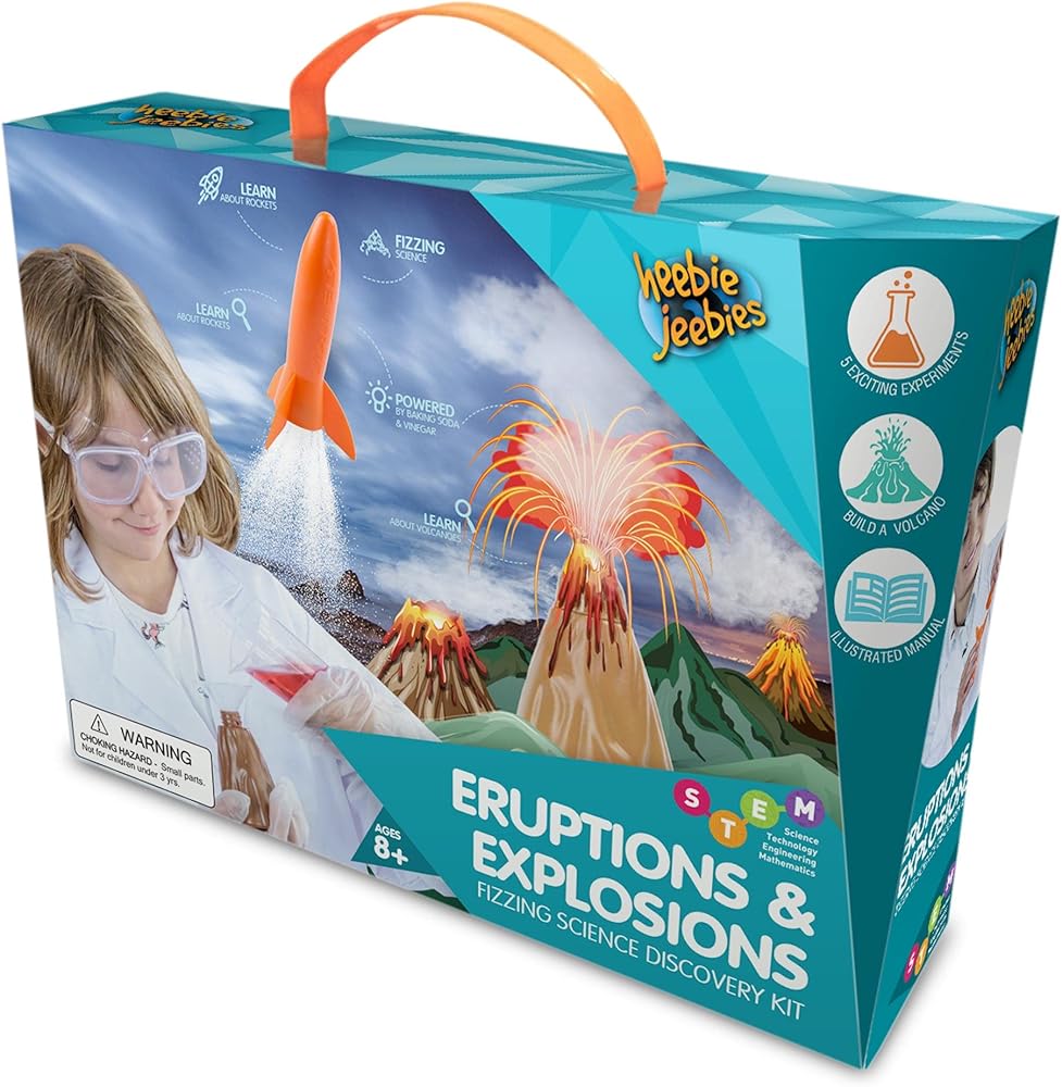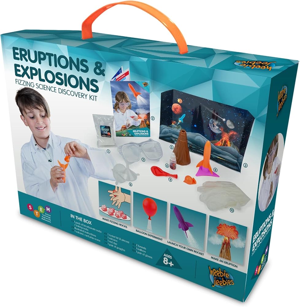 الثورات والانفجارات من هيبي جيبيز - 5 تجارب علمية ممتعة وآمنة للأطفال من سن 8 سنوات فما فوق - بركان وصاروخ وأكثر - مجموعة كيمياء العلوم والتكنولوجيا والهندسة والرياضيات. تعتبر مجموعة Eruptions and Explosions مثالية لأي عالم ناشئ يحب التدريب العملي ومشاهدة الفقاعات والتجارب. أكمل 5 تجارب، بما في ذلك إطلاق صاروخ، وصنع بركان، ونفخ البالون بدون فمك - كل ذلك باستخدام تفاعل البيكربونات والخل. بعد الانتهاء من كل تجربة، يمكنك التعرف على كيفية عمل البراكين والصواريخ والقوى الطبيعية من خلال كتيب تعليمي بداخله. هذه هي أداة تعلم العلوم والتكنولوجيا والهندسة والرياضيات (STEM) الممتعة المثالية للفتيات والفتيان. تأتي المجموعة مع نموذج بركان وصاروخ ومواد كيميائية ومعدات بما في ذلك النظارات الواقية والقفازات.