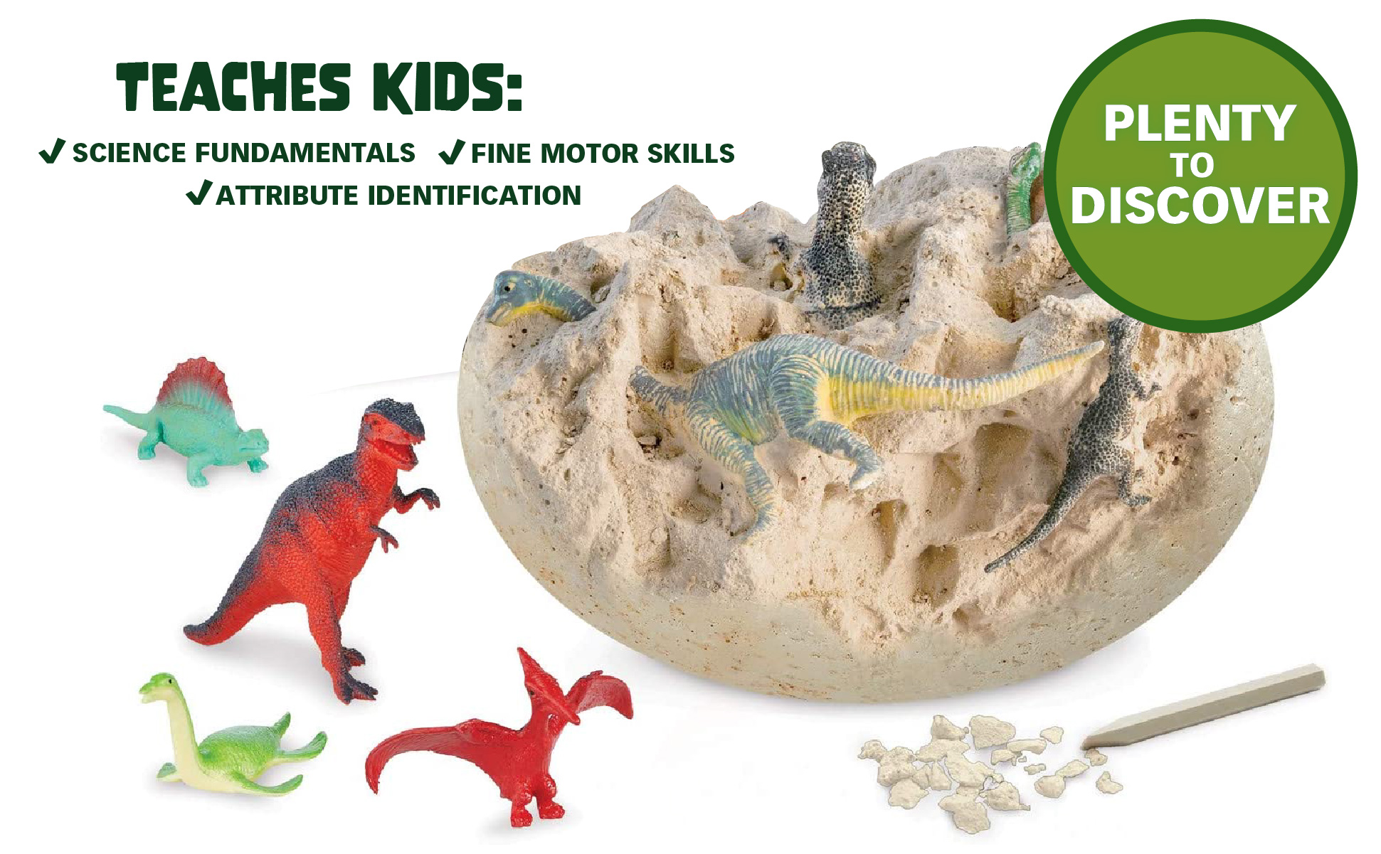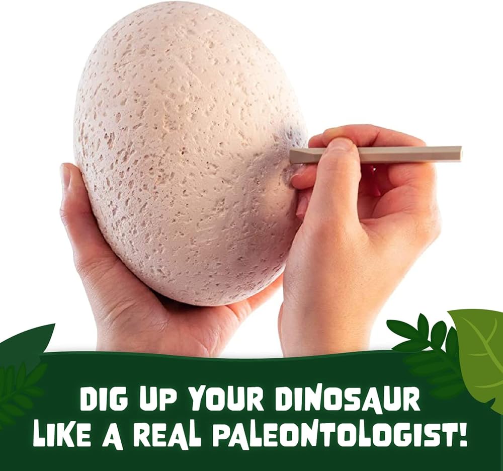 خذ صدعًا في هذه البيضة واكتشف جميع الأنواع السبعة المختلفة من الديناصورات المخبأة في الداخل! هل سوف تجد ستيجوسورس أولا، أم الجويّة تي-ريكس؟ تعلم المزيد عن كل مخلوق باستخدام دليل التنقيب عندما تنتهي. ما عليك سوى نقع البيض في وعاء أو حوض، وقم بالتقطيع مع إزميلك، واكتشف!