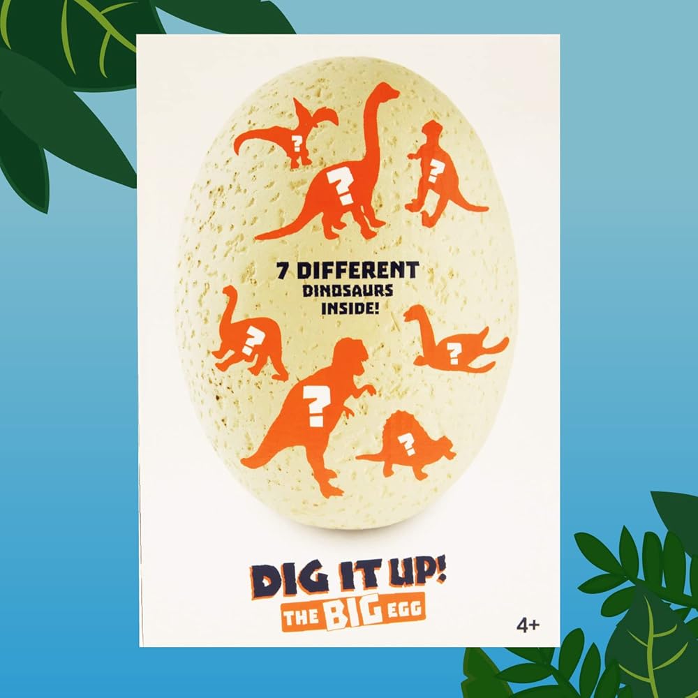 تتضمن بيضة ضخمة مقاس 17.78 سم × 10.16 سم، و7 ديناصورات مختلفة، و2 من أدوات النزع ودليل التنقيب والتعليمات