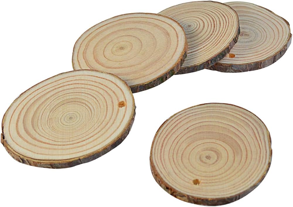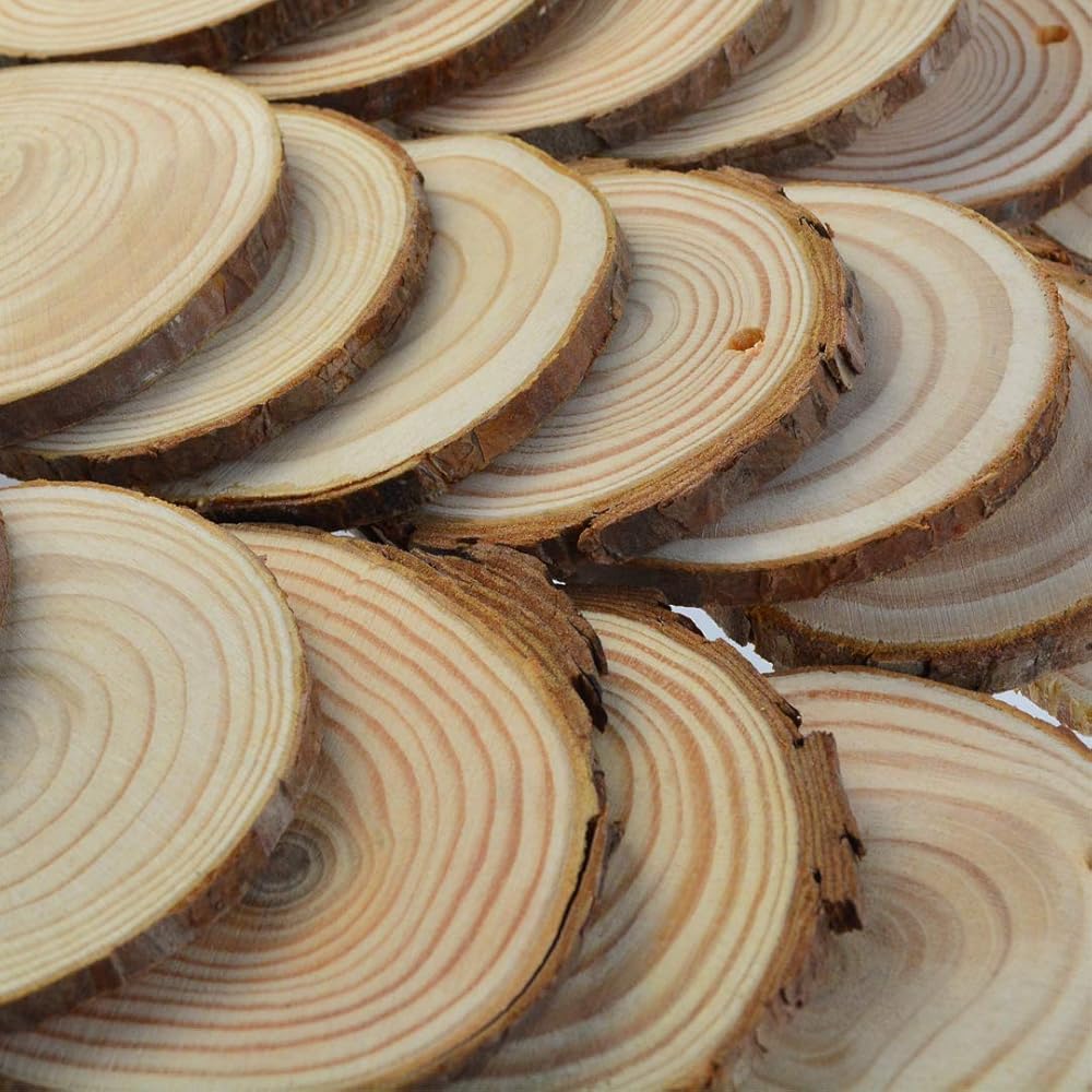 NATURAL ORIGINAL: The natural wood slices are hand-cut pieces of pine wood with a thickness between 2.4 and 2.8 inches, a thinner diameter is small and a thicker diameter is big. All of our wood slices are pre-polished and pre-drilled.
