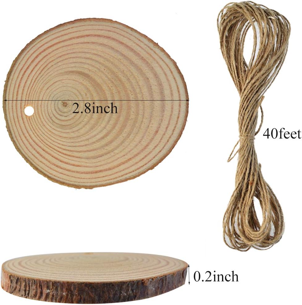 EASY TO USE: The quality of our hole wooden circles is very good. Easy to write or draw. Each slice is drilled with small holes. And we have a 40 feet free natrual jute rope that makes it easy to hang from any place you want to decorate.