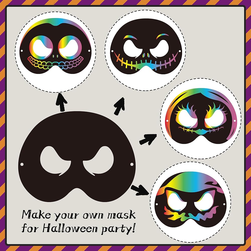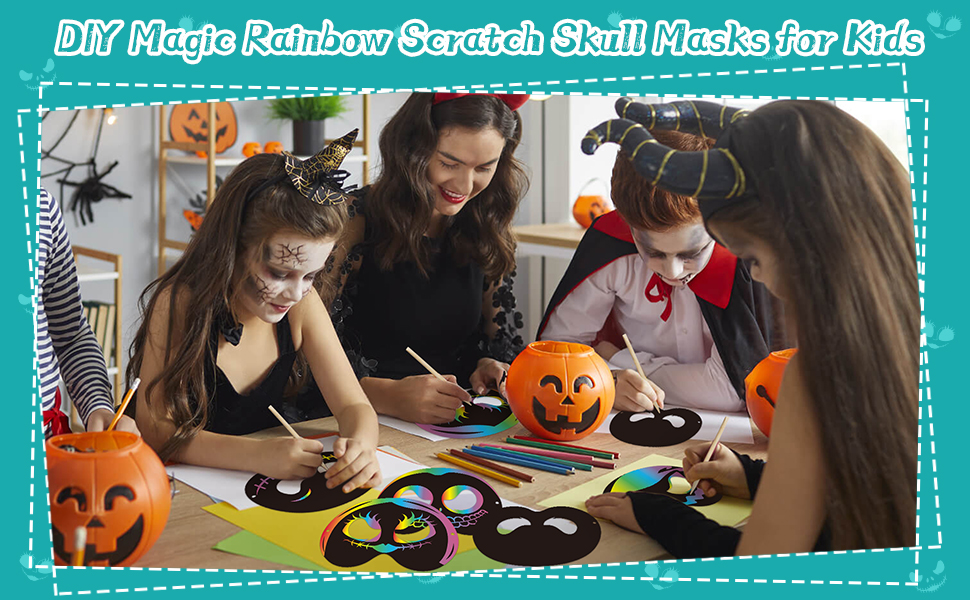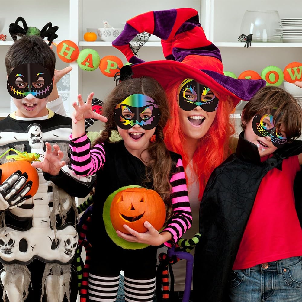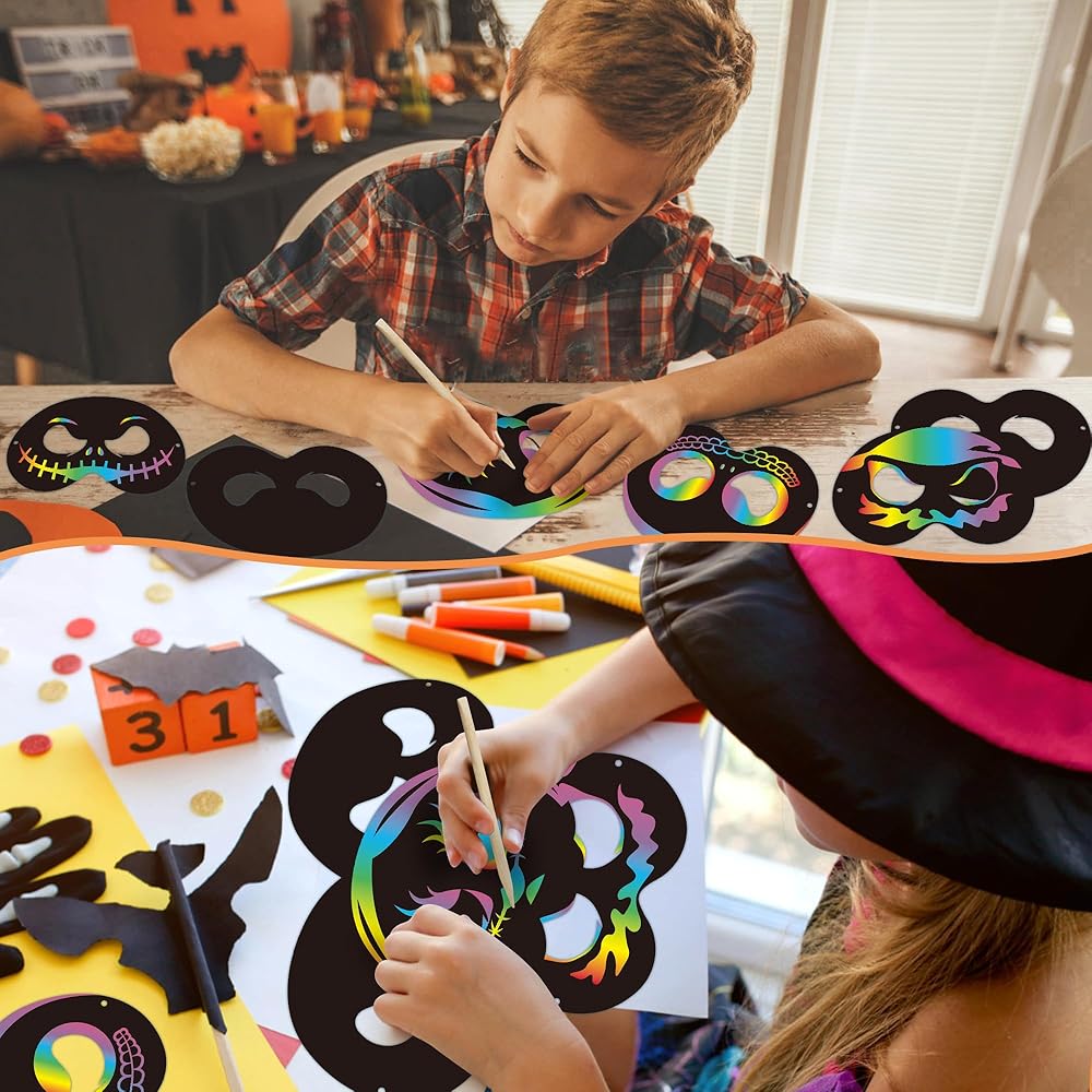 Perfect Halloween Party Favors: Delight young party guests with our one-of-a-kind Scratch Mask Gift Set. As they scratch away the surface, vibrant rainbow colors will magically appear, bringing these Skull Masks to life! A fantastic addition to any Halloween party or trick-or-treat event.