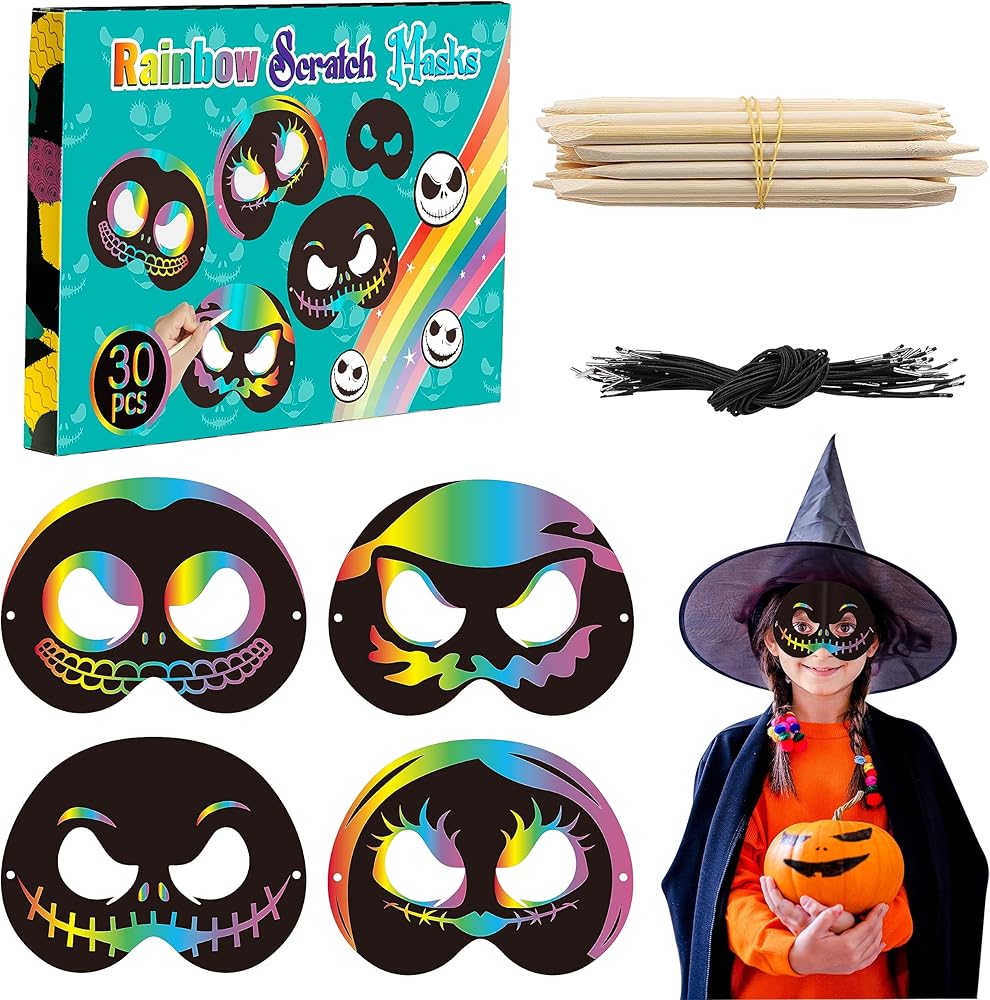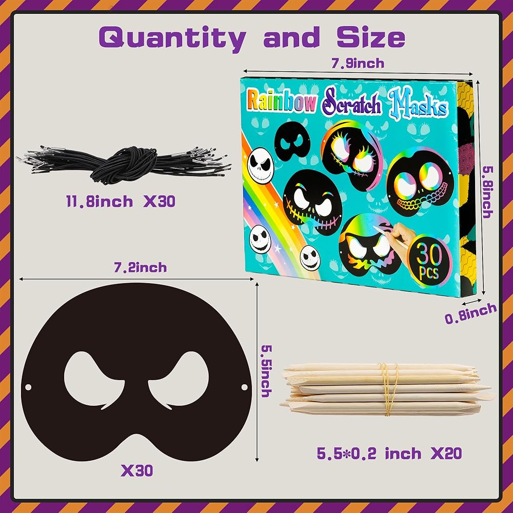 Z1juce 30 قطعة قناع عيد الميلاد جاك وسالي للخدش، مجموعة هدايا للأطفال، أقنعة قوس قزح سحرية للخدش للأطفال، هدايا حفلات عيد الميلاد، مجموعة أدوات فنية بألوان قوس قزح للأنشطة المدرسية