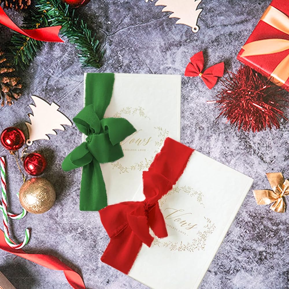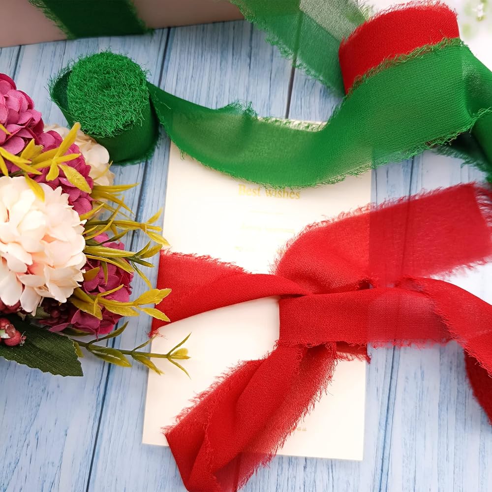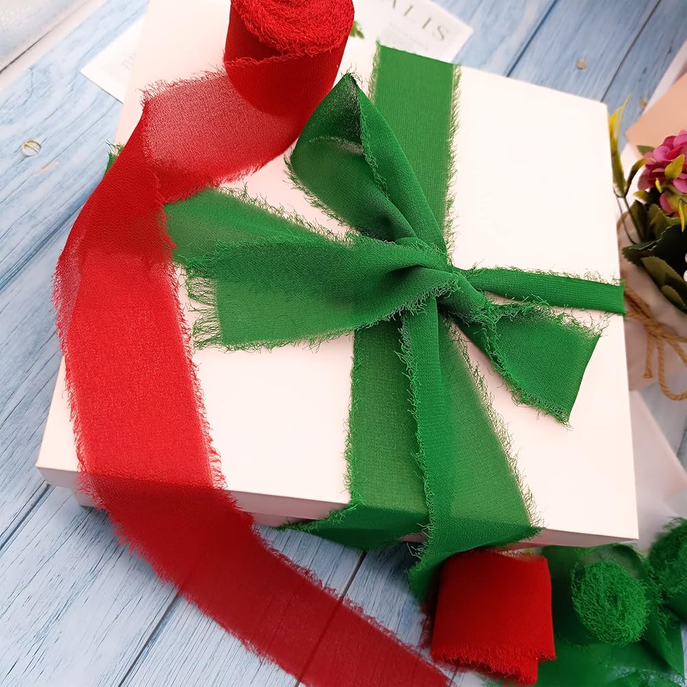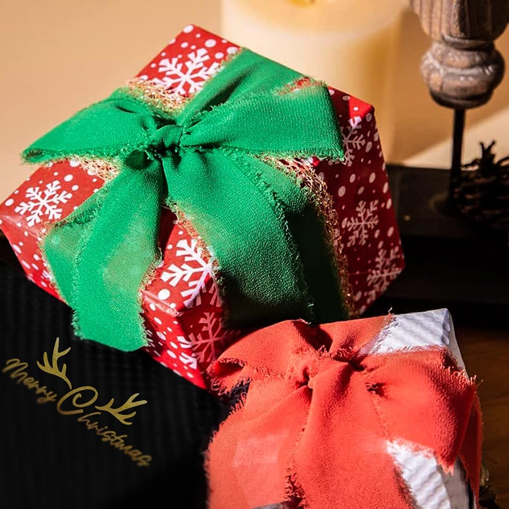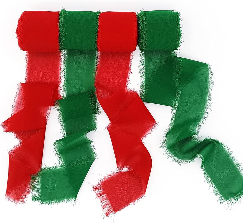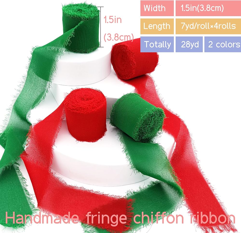 4 لفات من شريط شيفون عيد الميلاد مصنوع يدويًا من شريط شيفون مقاس 1.5 بوصة × 7 ياردات، مجموعة شريط عيد الميلاد باللون الأحمر والأخضر لتغليف الهدايا ودعوات الزفاف DIY وحرف يدوية ودعوة لتزيين حفلات عيد الميلاد