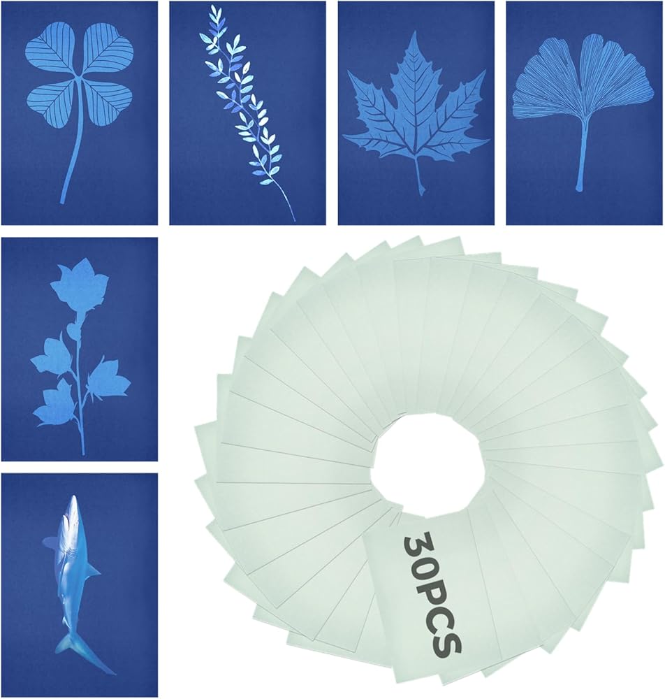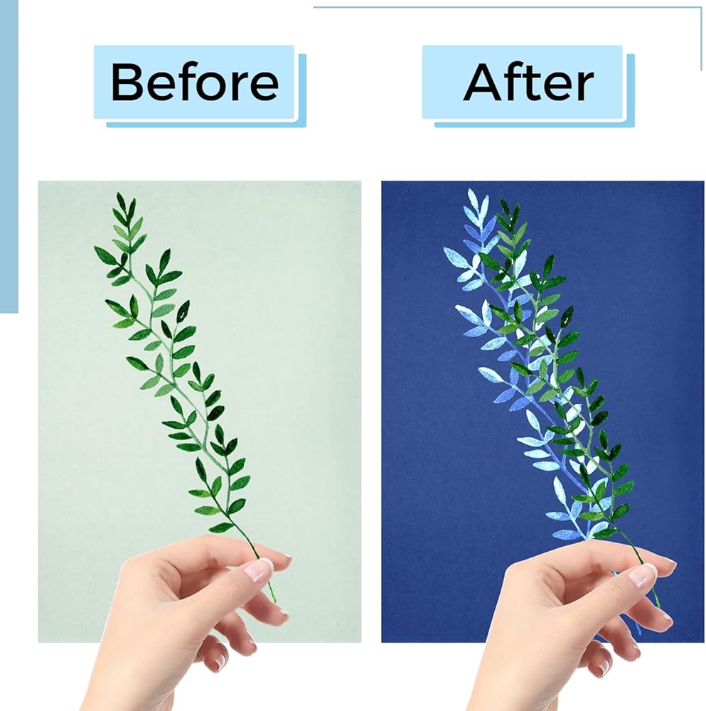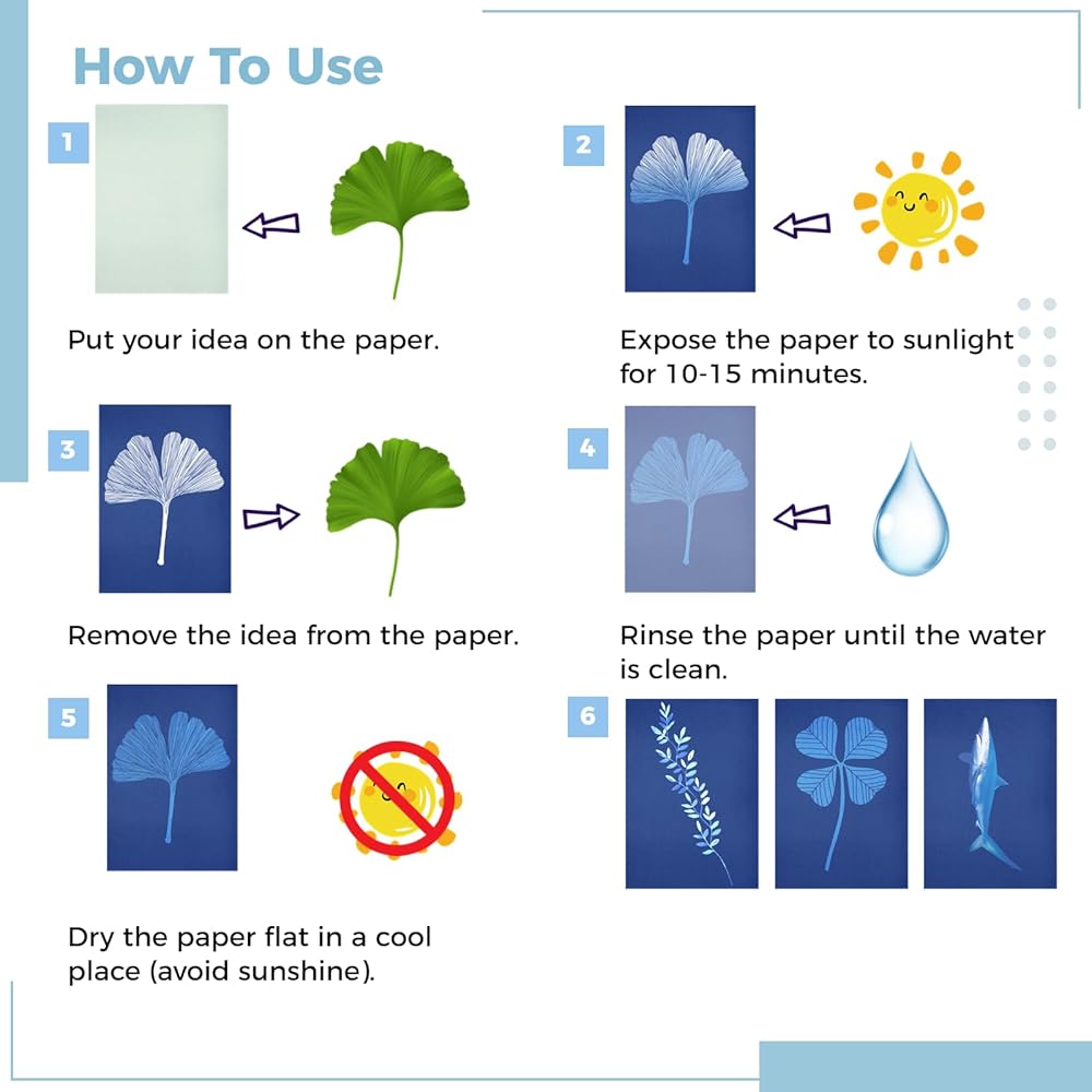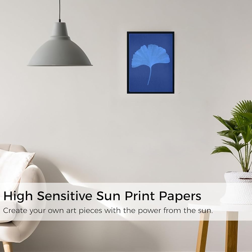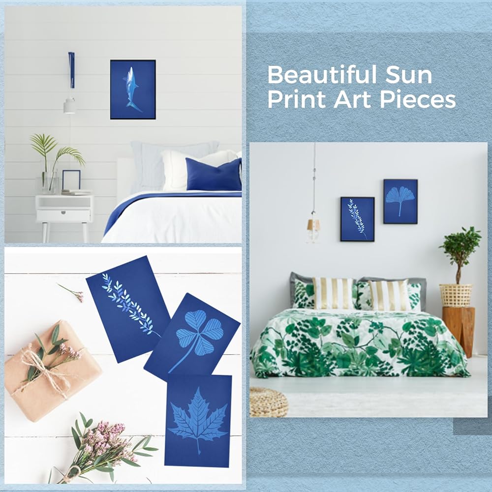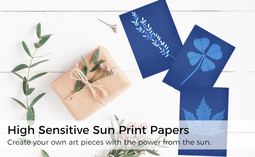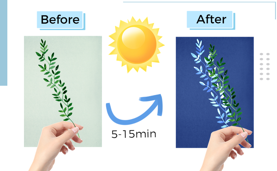 سهلة التشغيل: ضع النباتات أو قصاصات الورق أو غيرها من الأشياء على ورق الطباعة الشمسية، ثم اضغط عليها بورق أكريليك، وجففها في الشمس لمدة 10 دقائق. ثم اشطف الورقة تحت الصنبور لمدة دقيقة واحدة، واتركها تجف وانتهى العمل الفني
