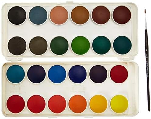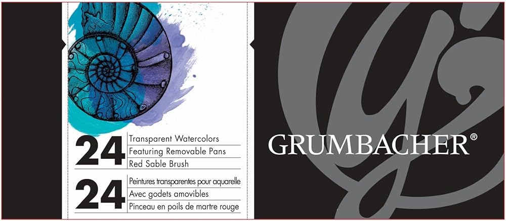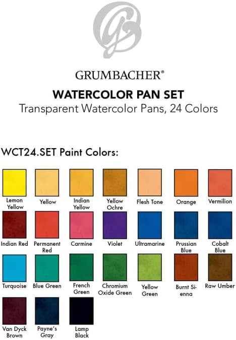 استمتع بالتغطية المخملية للألوان المائية غير الشفافة من Grumbacher. تُسكب الألوان في قوالب دائرية كبيرة يتم إدخالها داخل وخارج الصواني للتنظيف وإعادة الترتيب. تشتمل المجموعة على 24 مقلاة، واحدة في كل من الألوان غير الشفافة التالية: أصفر فاتح، برتقالي فاتح، أحمر فاتح، قرمزي عميق، أصفر مغرة، سيينا المحروقة، أخضر ورقي، أخضر بحري، أزرق بروسي، أولتراماريني، أومبر، أسود، أصفر ليموني، الأصفر الهندي، والبنفسجي، والأزرق الكوبالت، والأزرق الفيروزي، والأخضر الفرنسي، والأرجواني، والأزرق السماوي، والزيتوني، ولون اللحم، والذهبي، والفضي. يتضمن أيضًا أنبوبًا واحدًا سعة 5 مل من اللون الأبيض الصيني وفرشاة واحدة مدببة ومستديرة باللون الأحمر.