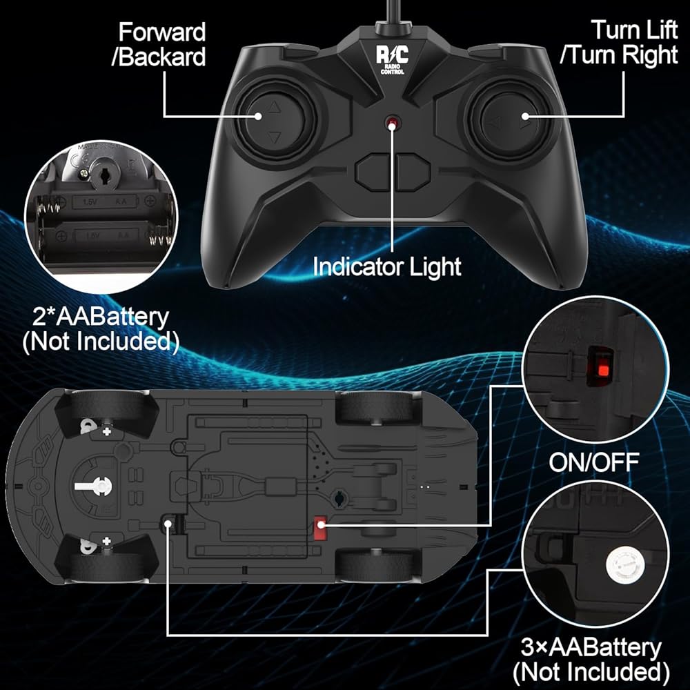【غير متضمنة بطارية AA】تحتاج سيارة لعبة RC هذه إلى 5 بطاريات AA إجمالاً، 3 منها تستخدم لسيارة RC و2 تستخدم لجهاز التحكم عن بعد. منتجاتنا لا تحتوي على بطاريات، عليك تحضيرها بنفسك