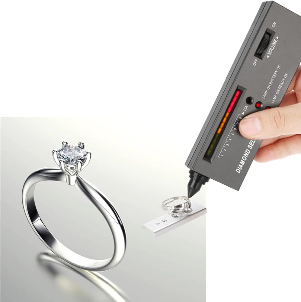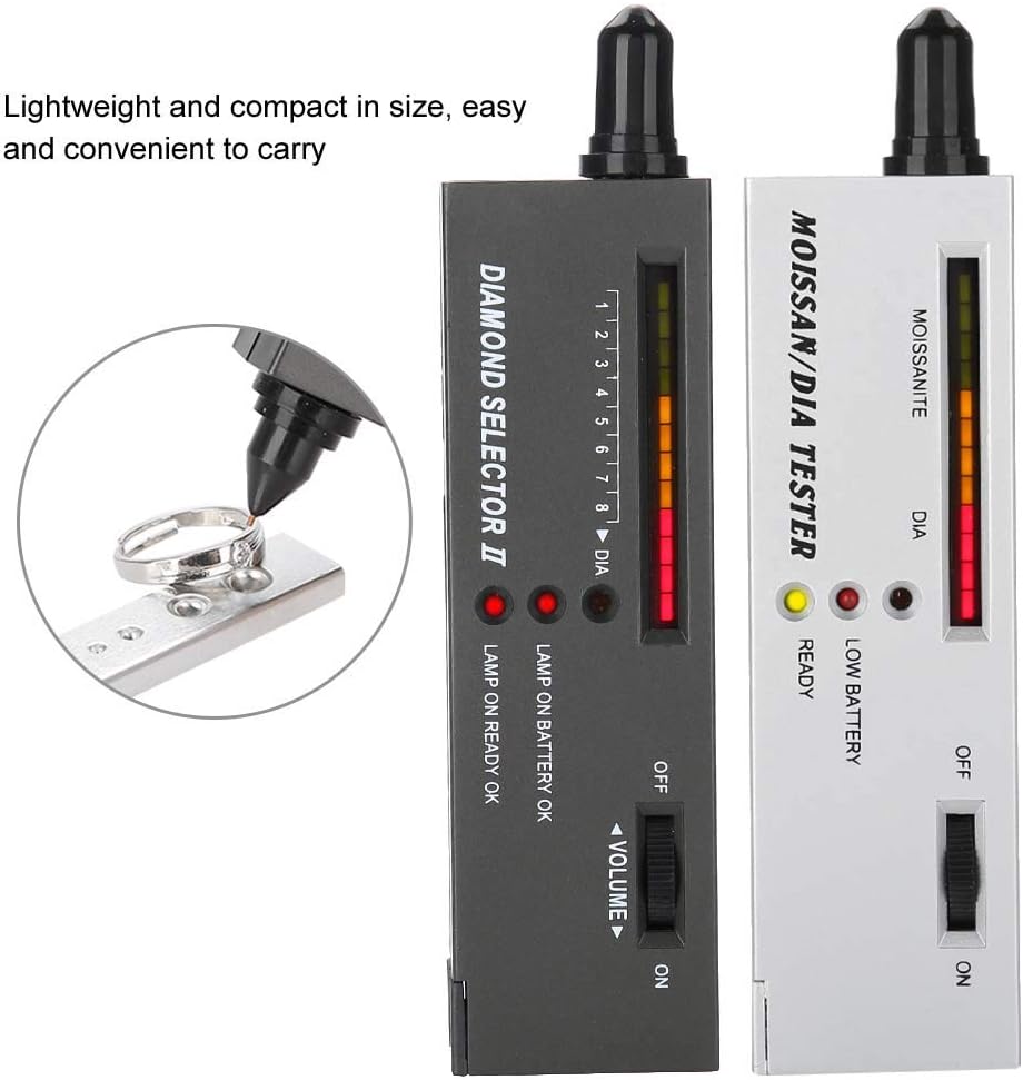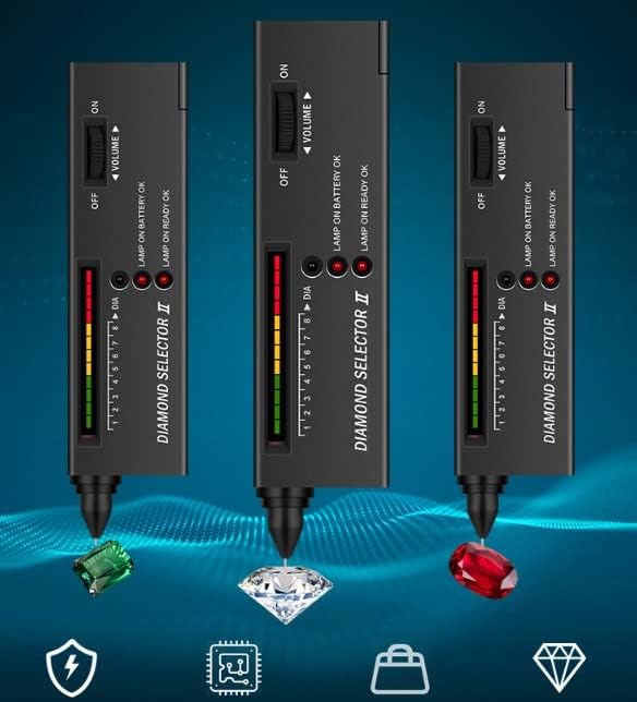 كيفية الاستخدام: يمكن أن يساعدك جهاز تحديد الماس II الخاص بنا على تمييز ما إذا كان الماس هو الماس الحقيقي أو الماس المزيف. إذا كان الماس ماسة حقيقية، فسيتم عرض المؤشر الأخضر على دايموند سيليكتور II. عندما يلمس المستخدم المعدن عن طريق الخطأ بدلاً من الحجر، سيصدر صوت طنين ثابت