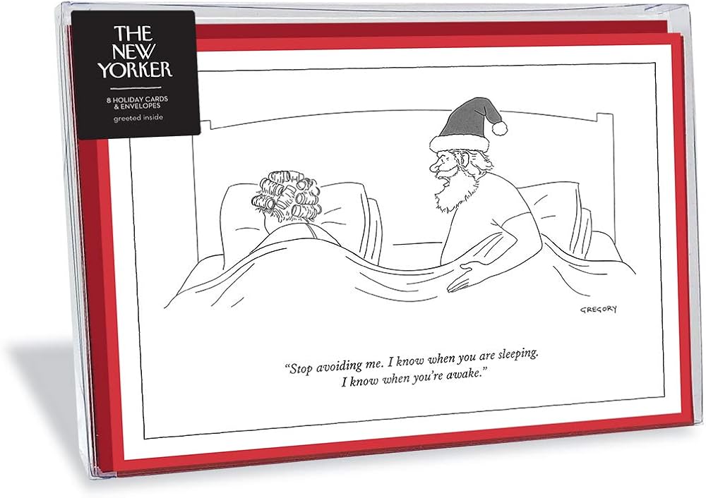 8 بطاقات مطابقة مع مغلفات في صندوق شفاف جذاب. تتميز البطاقات برسوم كرتونية من مجلة نيويوركر ابتكرها رسامو الكاريكاتير المشهورين. . اضحك في طريقك إلى العطلات مع بطاقات العطلات الكرتونية المرحة هذه من نيويوركر. مثالية لإرسال بطاقات العطلات البريدية