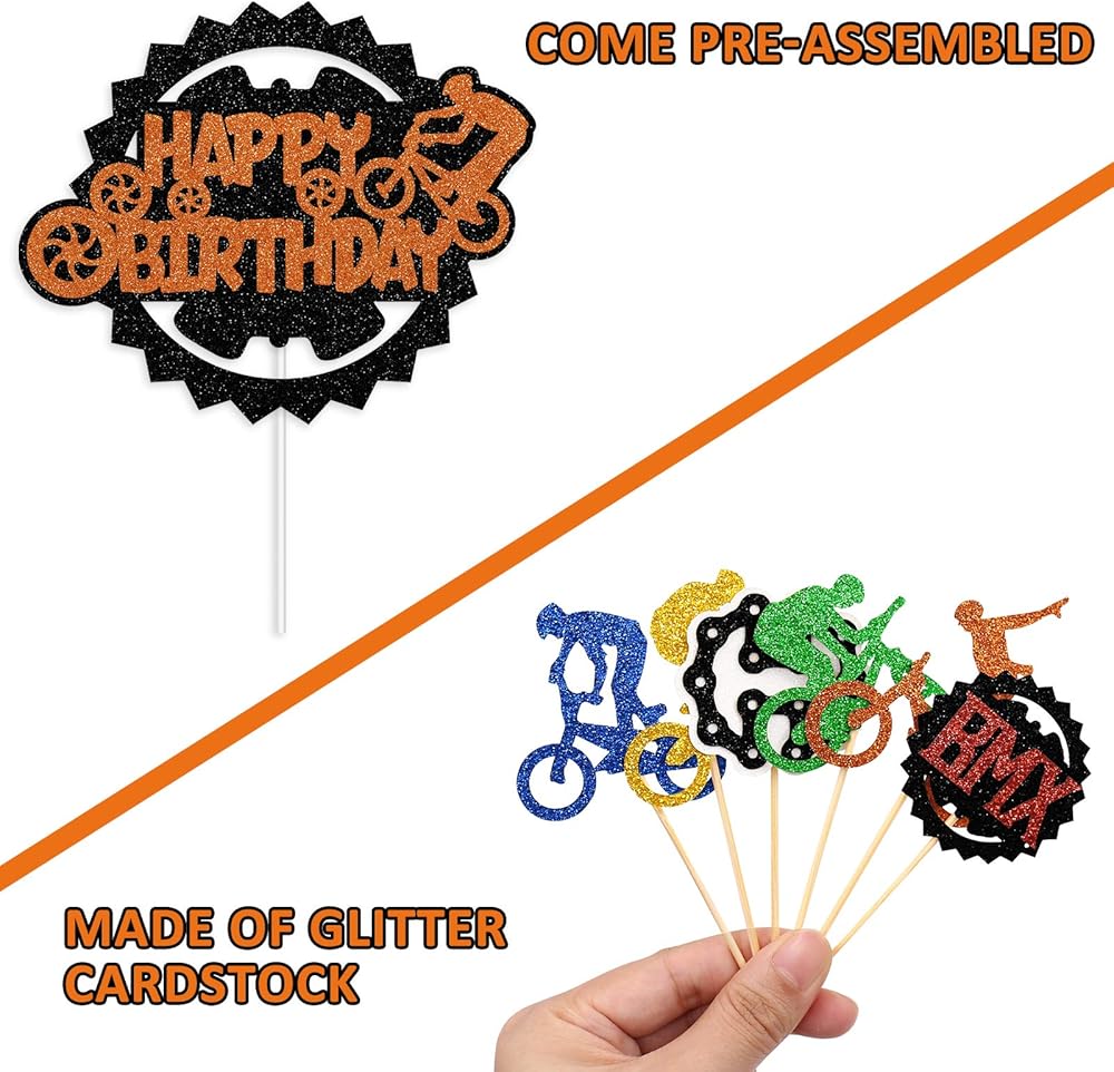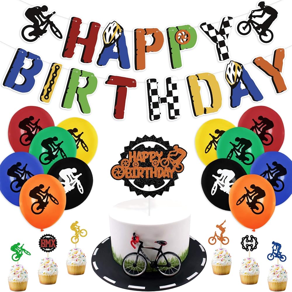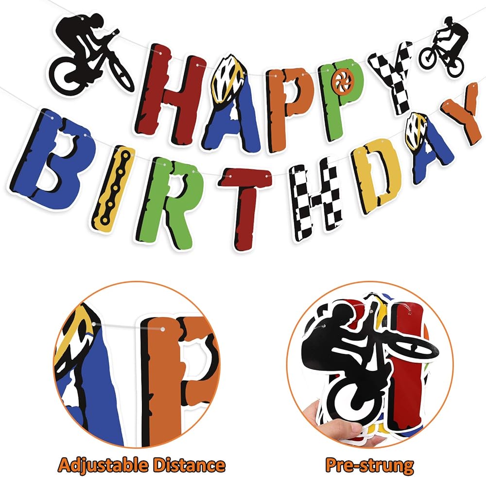 لافتات بي ام اكس بيرثداي: قطعتان من لافتات عيد الميلاد السعيد مصنوعة من ورق مقوى فاخر. مزينة بقبعة دراجة ملونة نابضة بالحياة وسلاسل الدراجات وأوضاع ركوب الدراجات. تأتي كل لافتة جاهزة للتعليق لتوفير وقتك في التحضيرات الأخرى للحفلات.