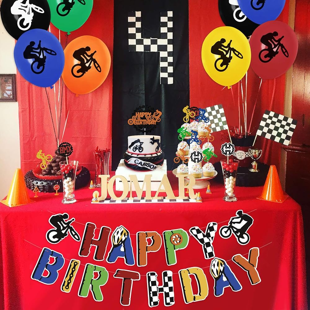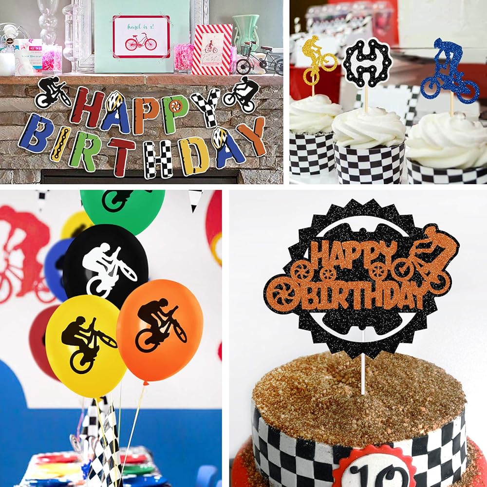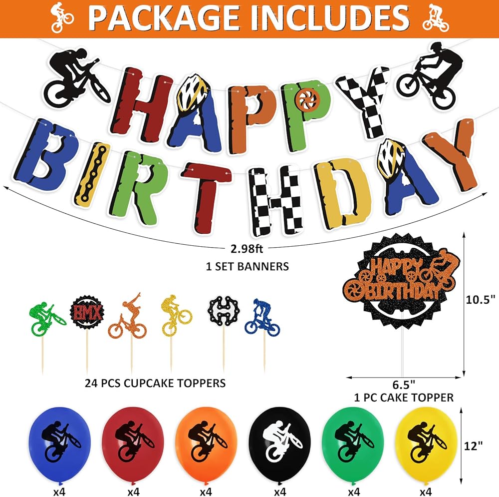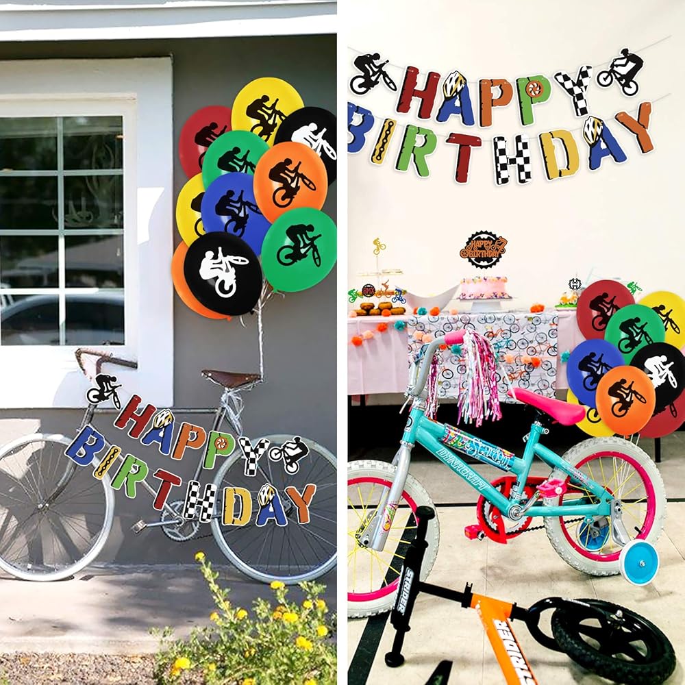 بالونات لاتكس: تتضمن بالونات اللاتكس المطابقة ستة ألوان من الأحمر والبرتقالي والأسود والأزرق والأخضر والأصفر. تحتوي كل واحدة على وضع دراجة مطبوع عليها. 24 قطعة من البالونات مقاس 12 انش ستضيف جوًا رياضيًا أكثر تطرفًا إلى حفلتك.