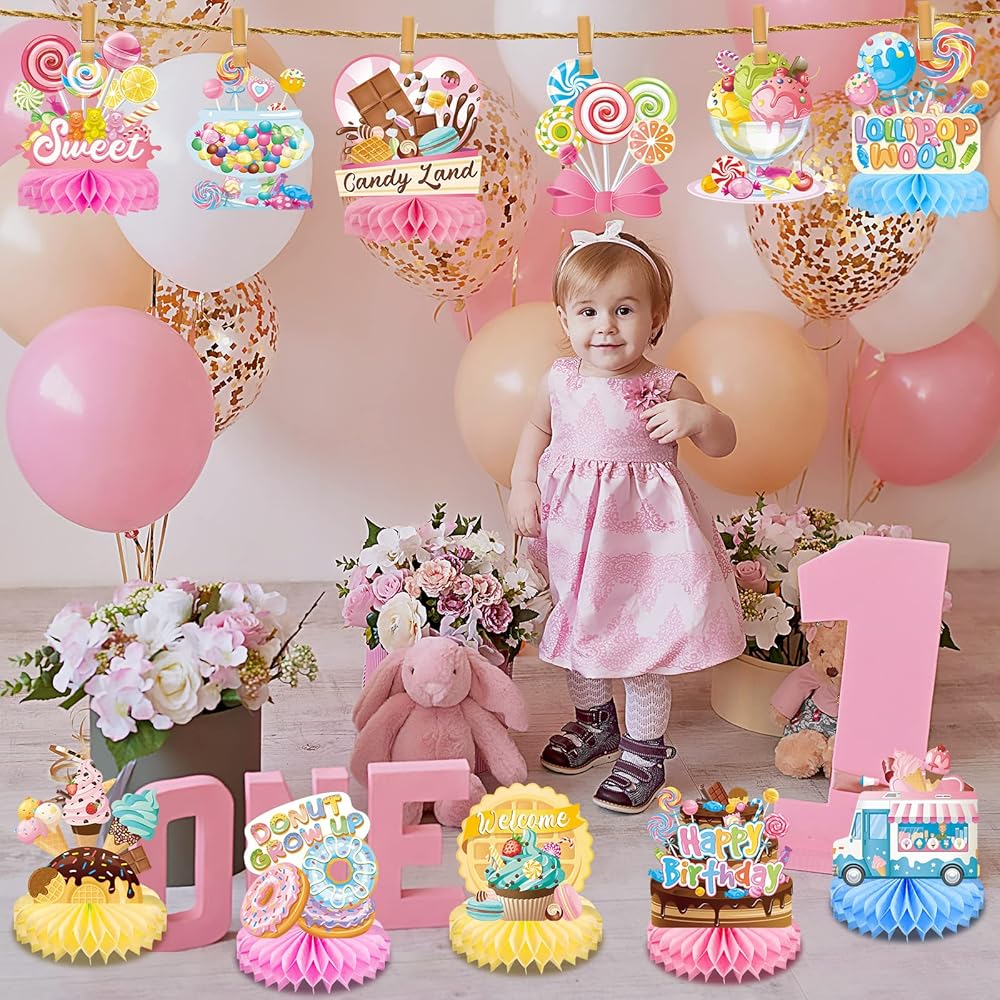 تصميم جميل: تحتوي القطع المركزية لطاولة الحفلات ذات الطابع الجميل على 12 بطاقة على شكل قرص العسل و12 نمطًا جميلًا مع الدونات والحلوى والآيس كريم والكيك، بألوان جميلة وحيوية ولطيفة، مناسبة للحفلات التي تحمل طابع الدونات، والتي يمكن أن تجعل حفلتك مميزة بسهولة