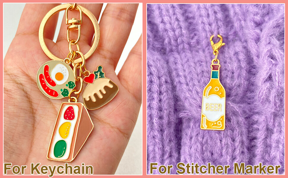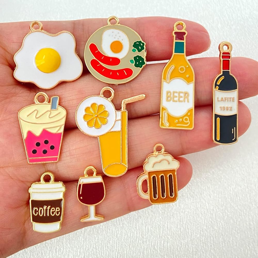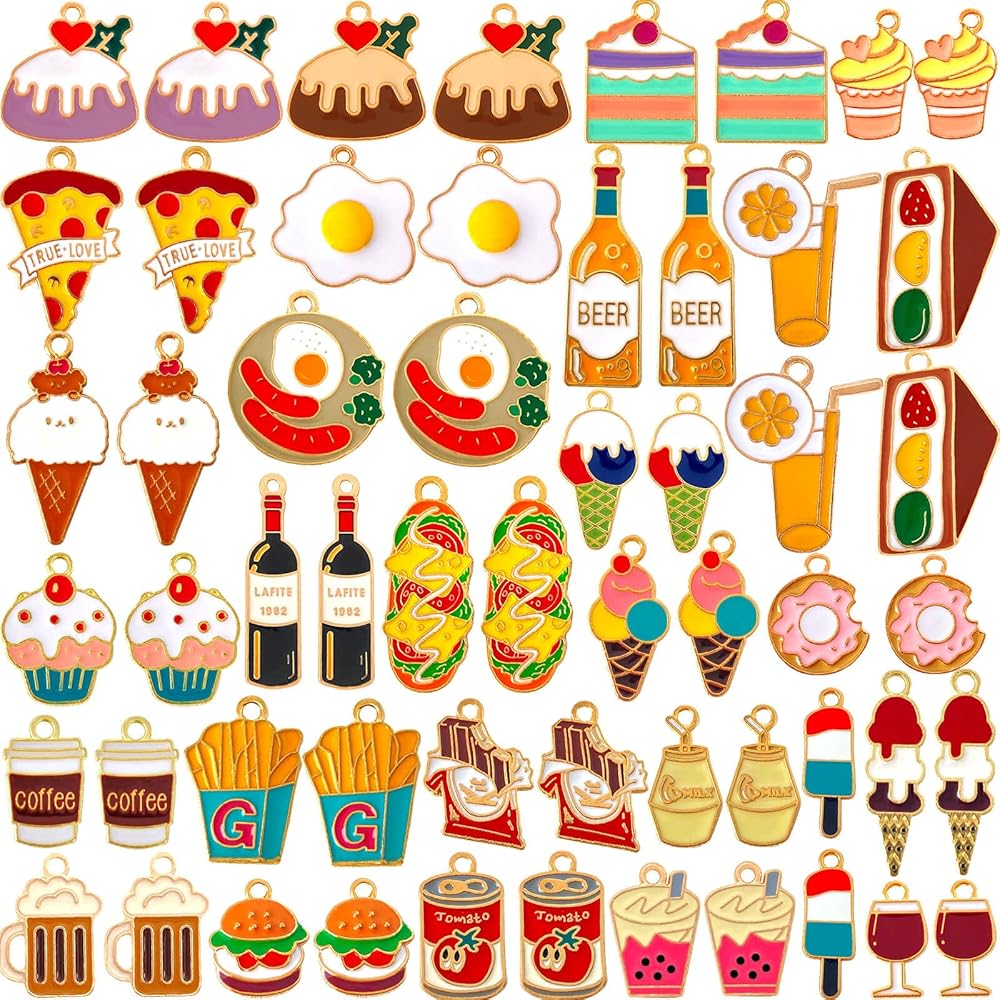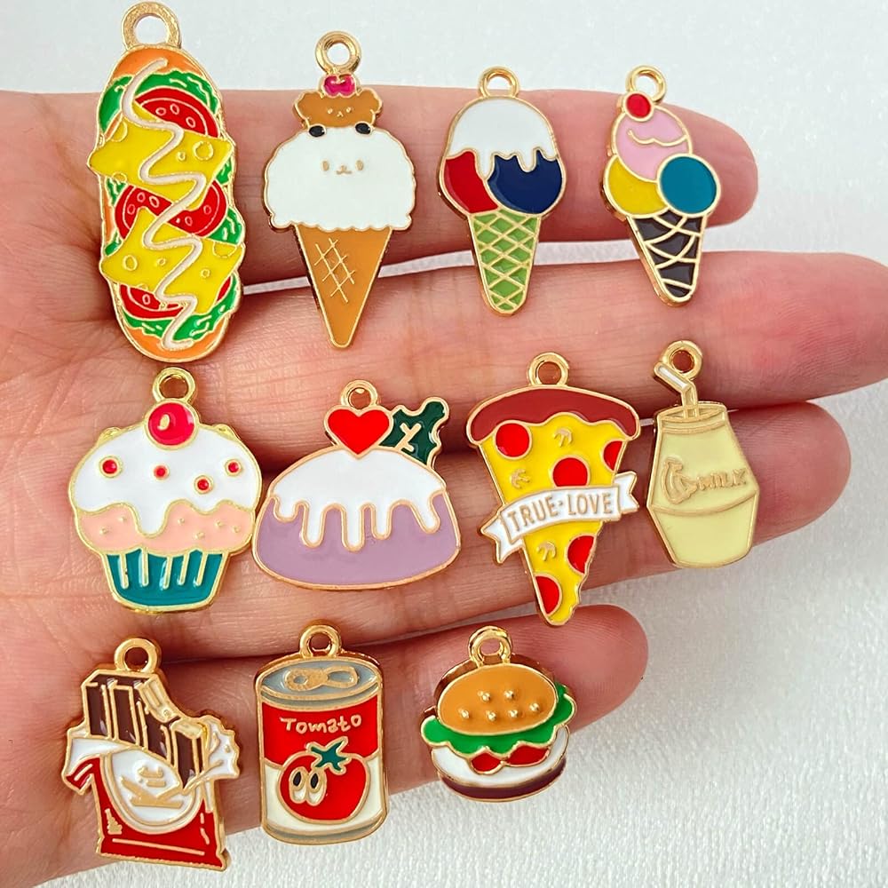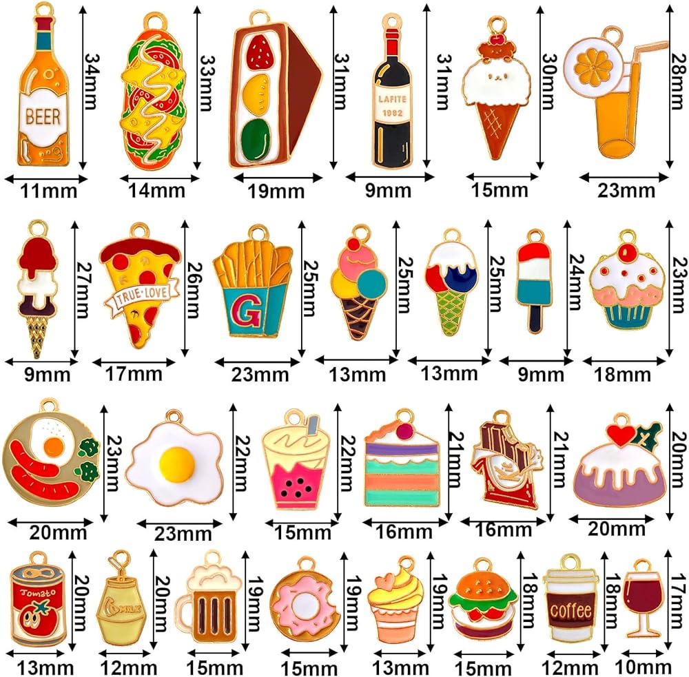 العديد من الاستخدامات: تُعد حليات الطعام هذه خيارًا رائعًا للأساور الساحرة والمعلقات والقلائد وسلاسل المفاتيح والأقراط وعلامات الغرز والإشارات المرجعية ومفاتيح السيارة وحليات زجاج النبيذ ومشروعات سجل القصاصات وما إلى ذلك. كما أنها خيار رائع لصنع الحرف اليدوية أو زينة للحفلات.