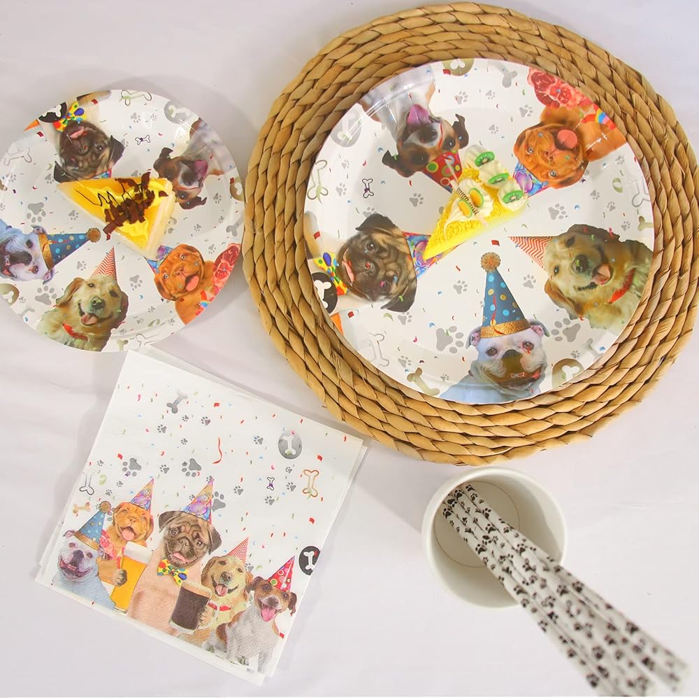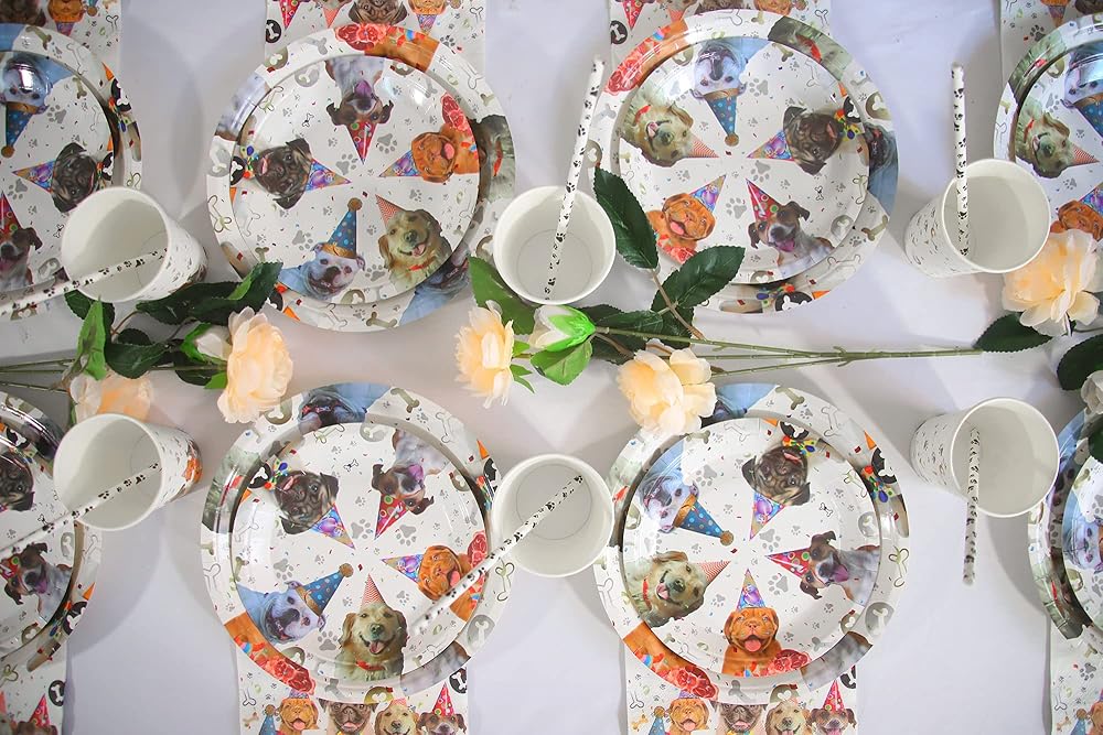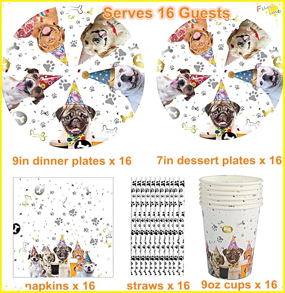 خدمة لـ 16 ضيفًا: لوازم حفلات الكلاب أدوات المائدة بما في ذلك 16 طبقًا ورقيًا للكلاب مقاس 22.86 سم × 40.64 سم × 17.78 سم × 16 كوب للكلاب × 16 شفاطة للكلاب، إجمالي 80 قطعة تخدم 16 ضيفًا