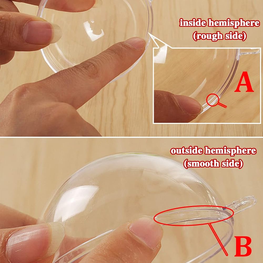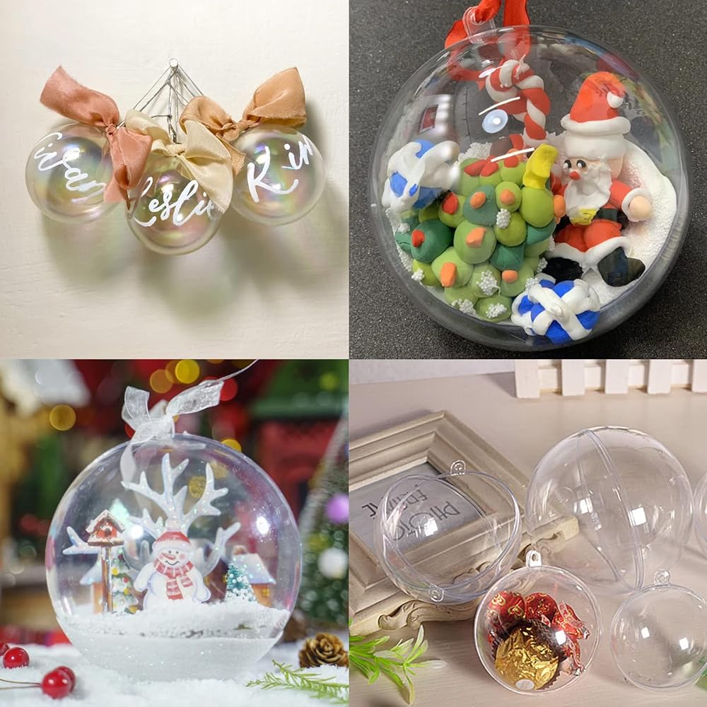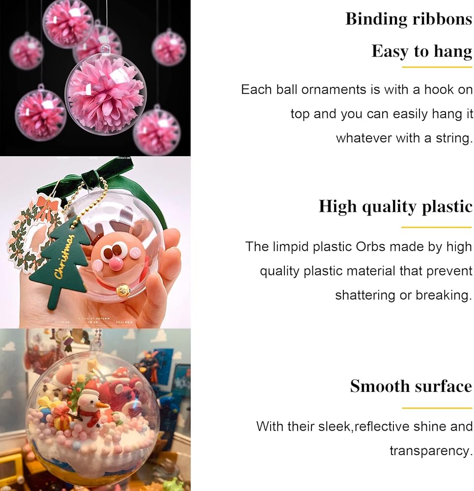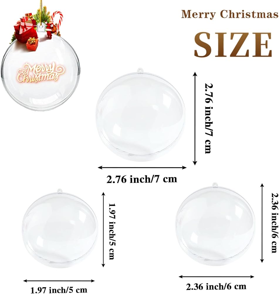 • تطبيق واسع: يمكنك ملء الكرات الشفافة بالأشياء المفضلة لديك مثل الأشرطة أو الحلي أو الخرز لتزيين شجرة عيد الميلاد أو مراكز التسوق أو الفنادق أو المنزل أو العروض النافذة أو يمكنك استخدامها في الصابون أو كرات الاستحمام وغيرها من الهدايا.