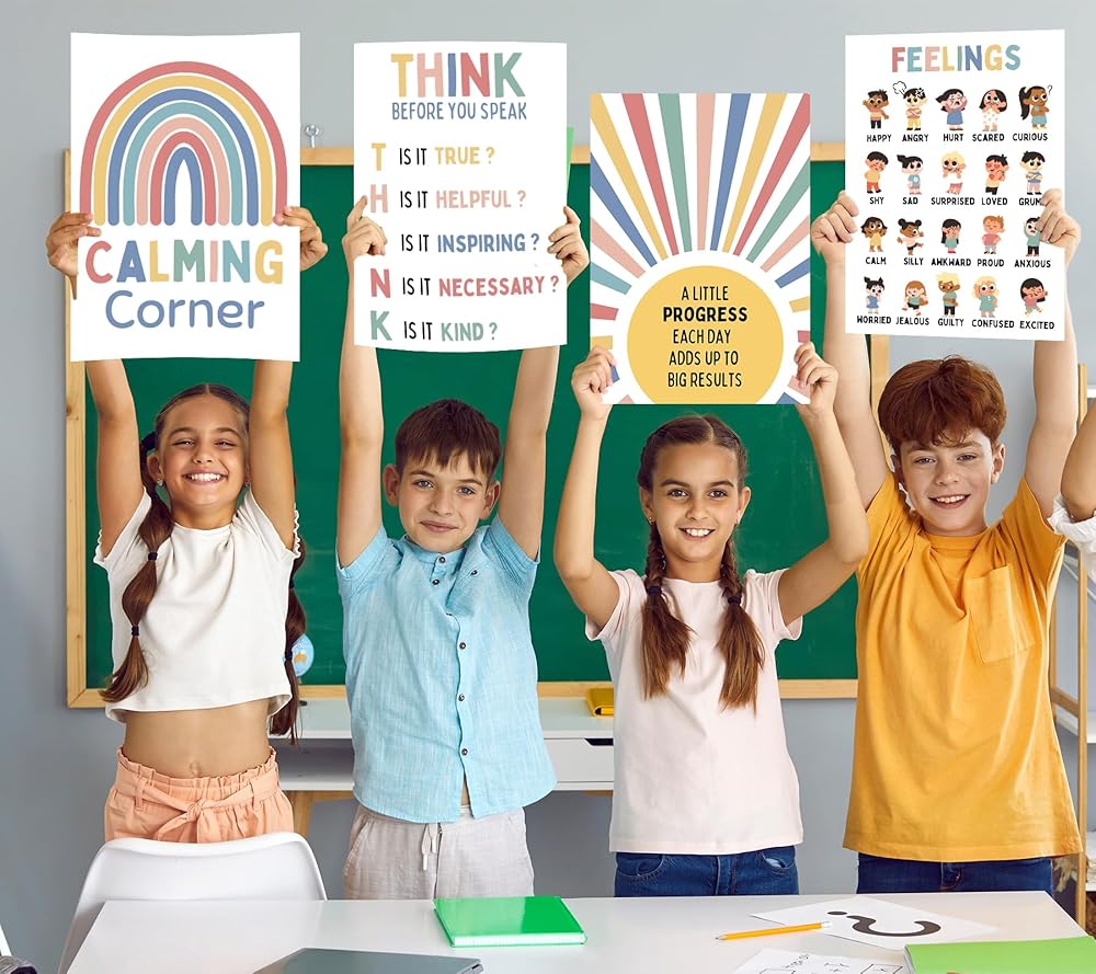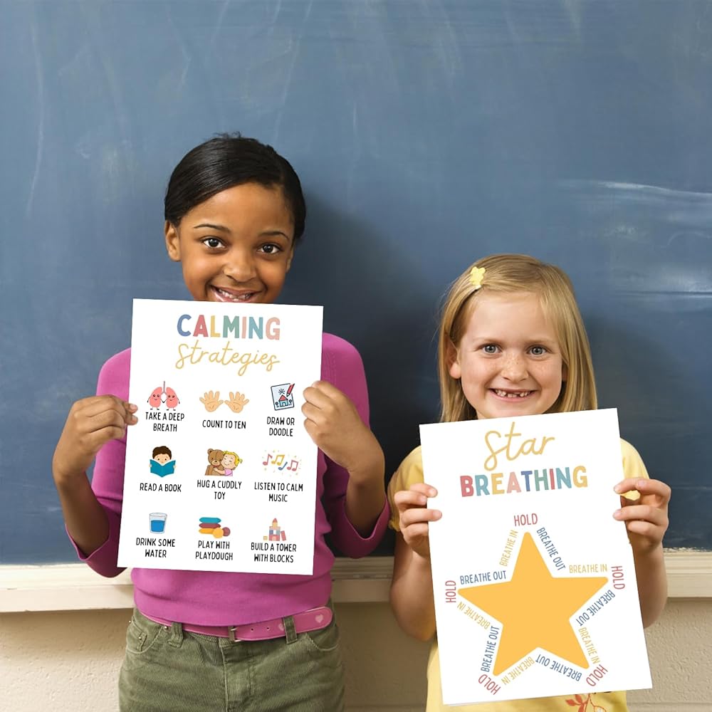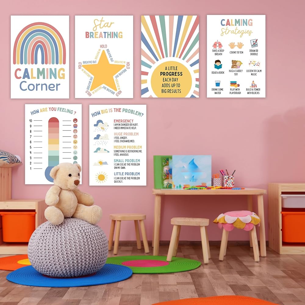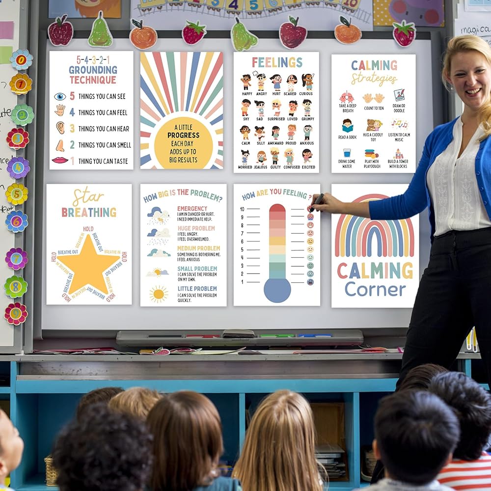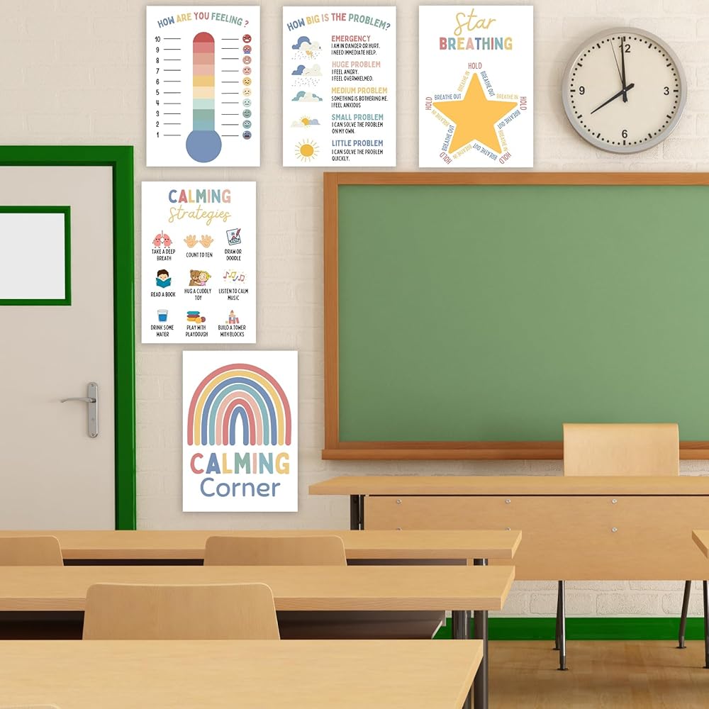 ملصقات تهدئة الزاوية التعليمية: توفر الملصقات التعليمية أدوات واستراتيجيات قيمة للطلاب للتهدئة والتعامل مع المشاعر بفعالية. إنها بمثابة مصدر عملي وداعم للمعلمين والطلاب على حد سواء.