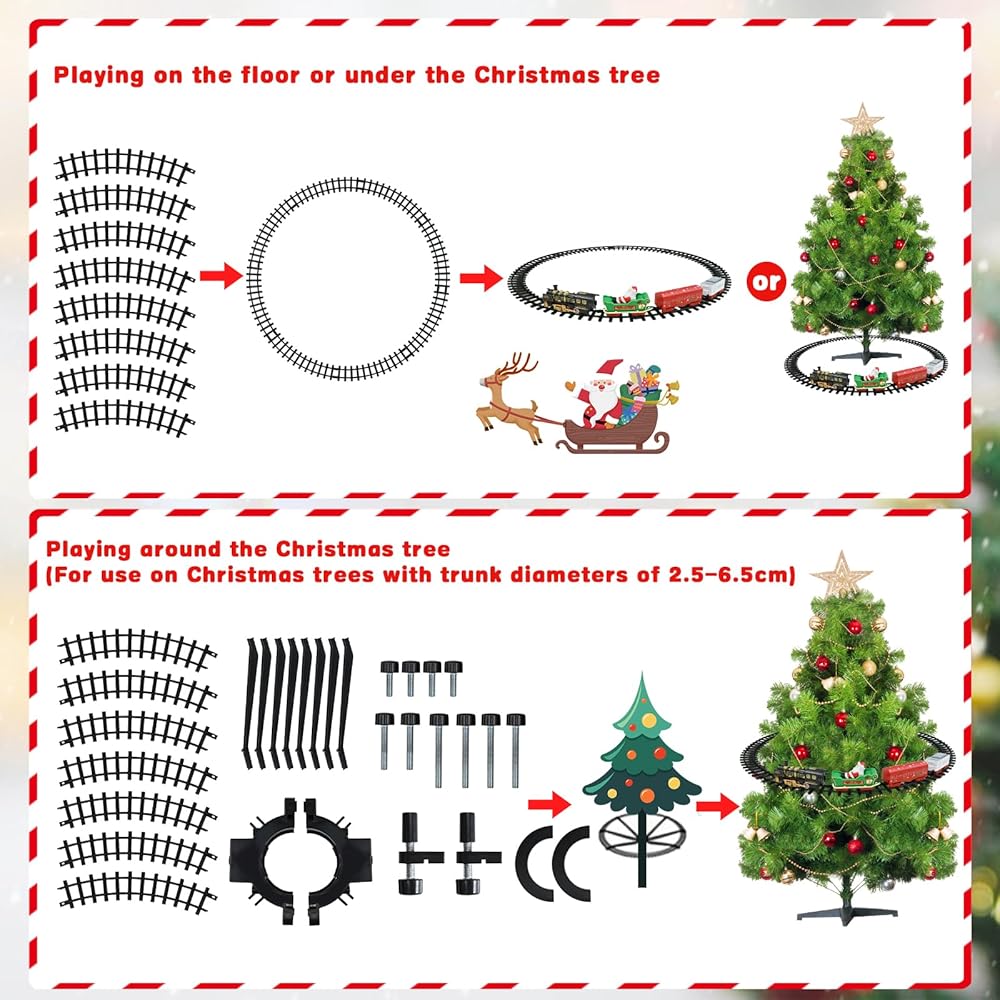 【حول/ تحت شجرة الكريسماس】يمكنك تعليق مسار القطار في منتصف شجرة الكريسماس أو وضعه تحت الشجرة. بالمقارنة مع القطارات التقليدية التي يمكنها السفر على الأرض فقط، ستكون هذه تجربة جديدة. تأتي المجموعة مع حوامل قابلة للتعديل، مناسبة لأشجار الكريسماس بقطر 2.5-6.5 سم/1-2.56 انش.