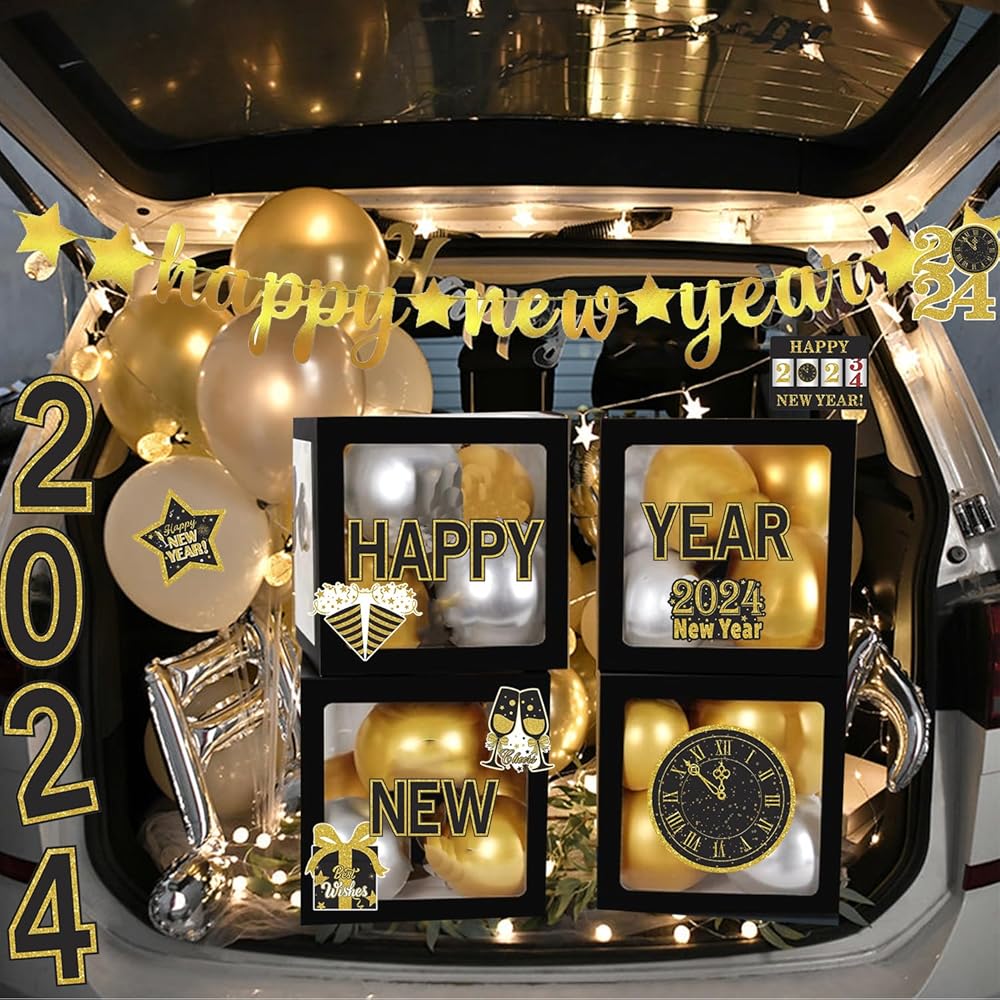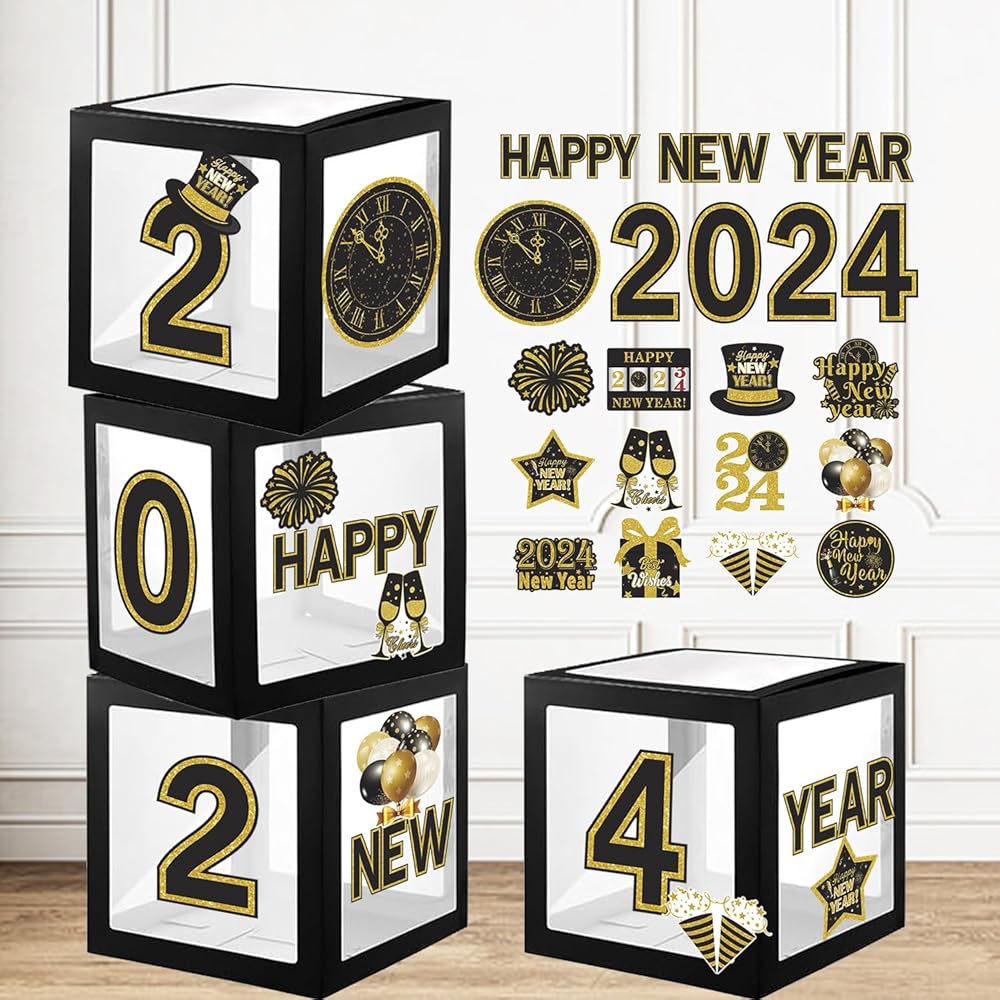 【Package Includes】You will receive 4 Happy New Year boxes and a set of 20 New Years Eve sticker cards.
