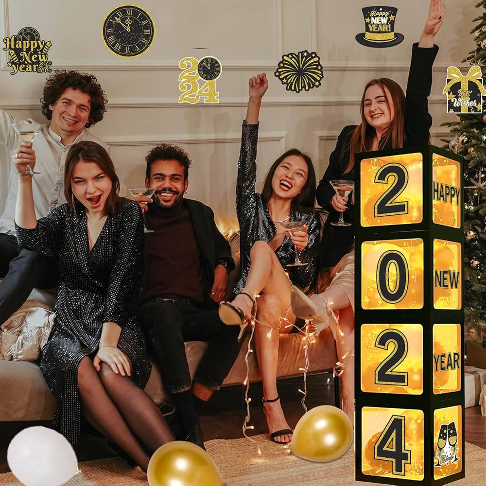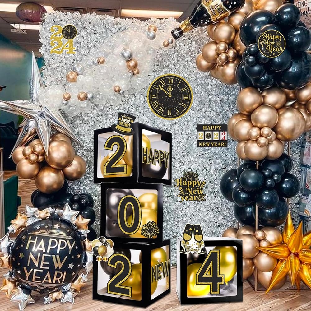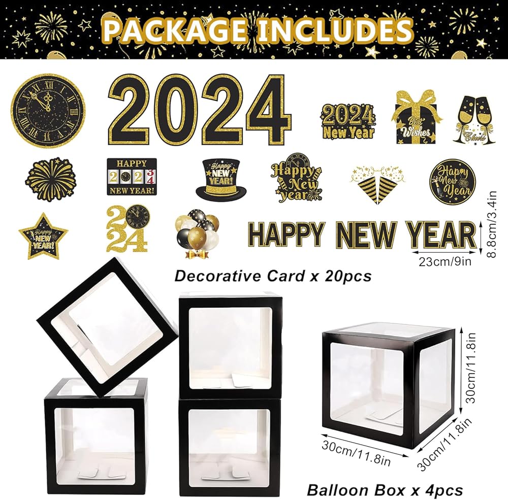 【High Quality】Our 2024 New Years Eve balloon boxes are made of thick and high-quality card, safe and durable, reusable, with clear printing and bright patterns, perfect New Years party decoration supplies.