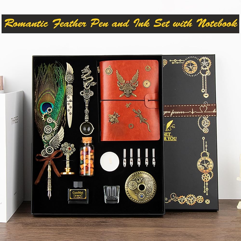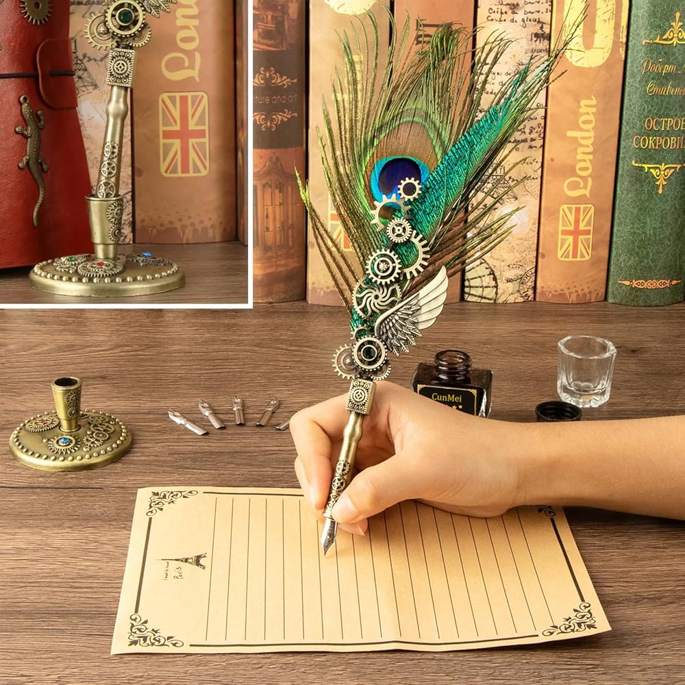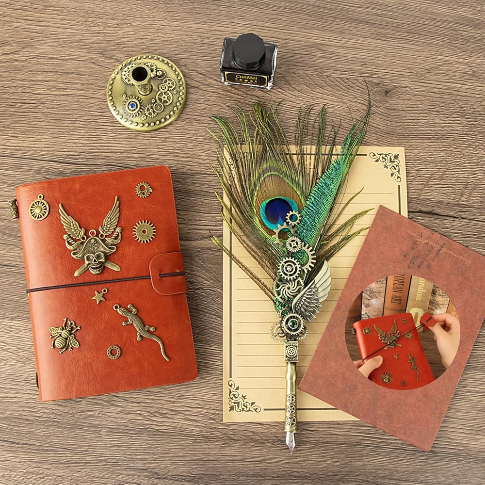 مجموعة أقلام وحبر CunMei، مع قلم ريشة دفتر ملاحظات جلدي، قلم غمس، طقم ختم ختم الشمع، هدية قلم الخط للنساء والرجال. (الطاووس)