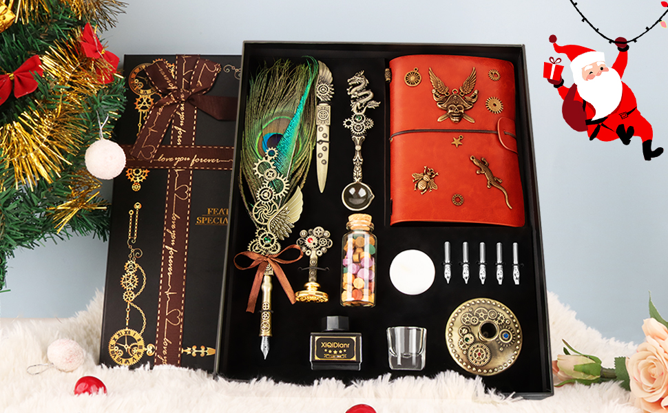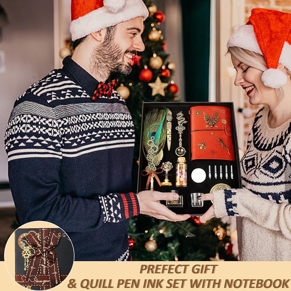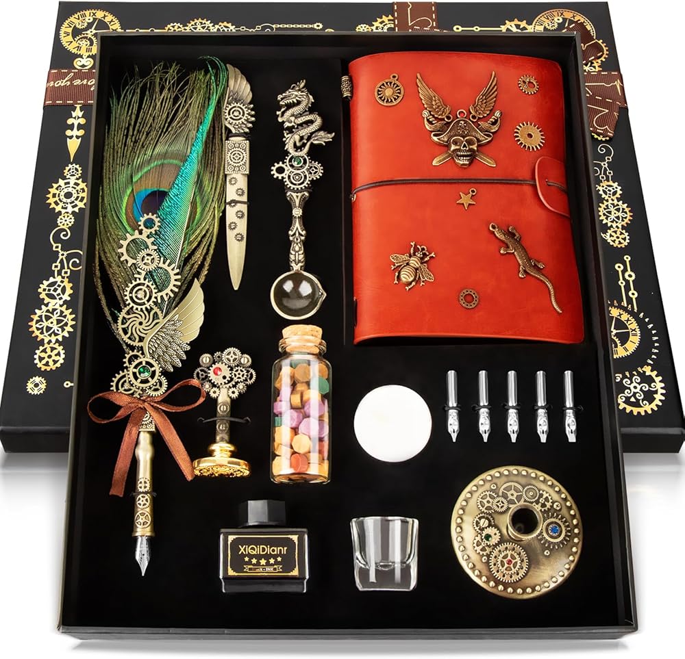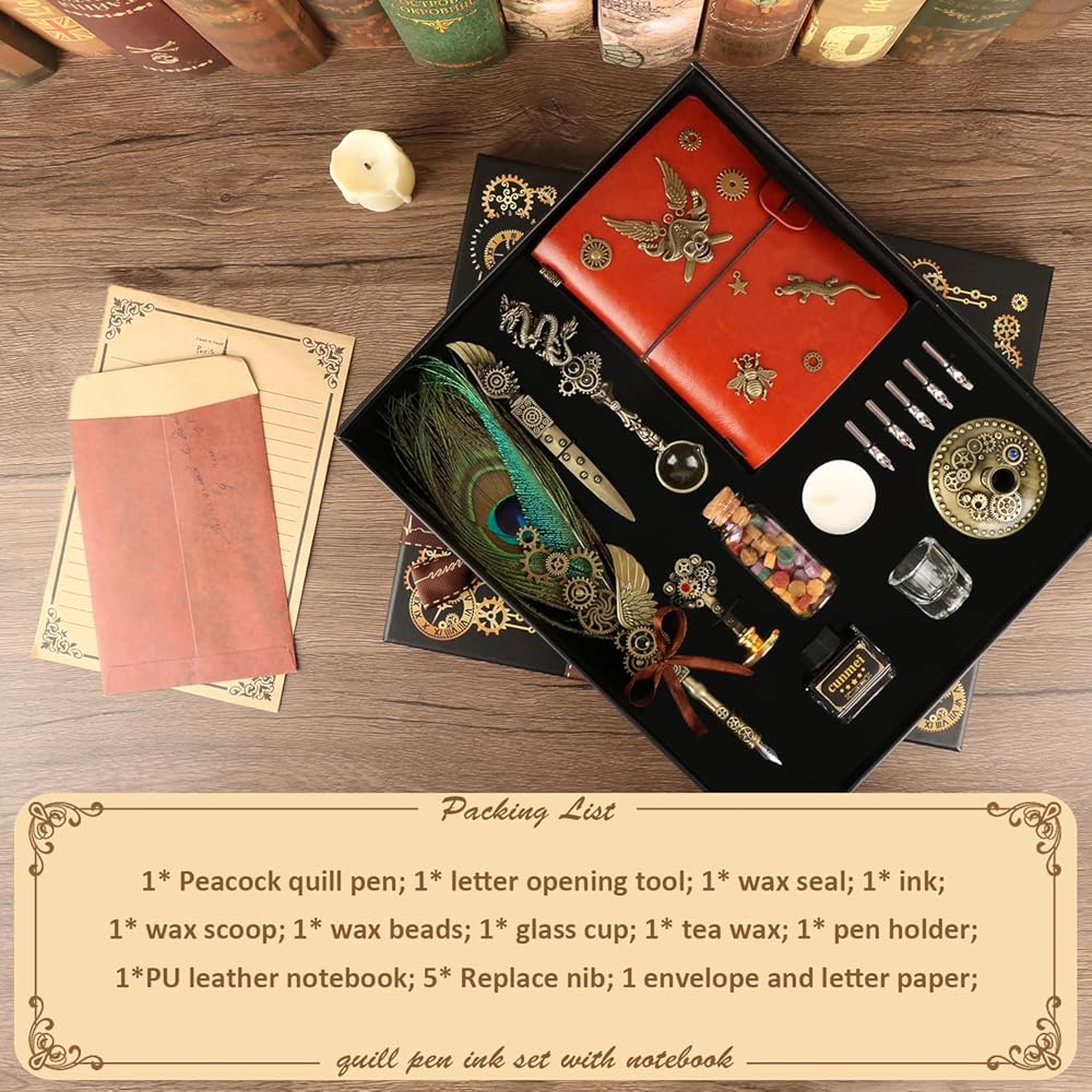 مجموعة أقلام وحبر CunMei، مع قلم ريشة دفتر ملاحظات جلدي، قلم غمس، طقم ختم ختم الشمع، هدية قلم الخط للنساء والرجال. (الطاووس)