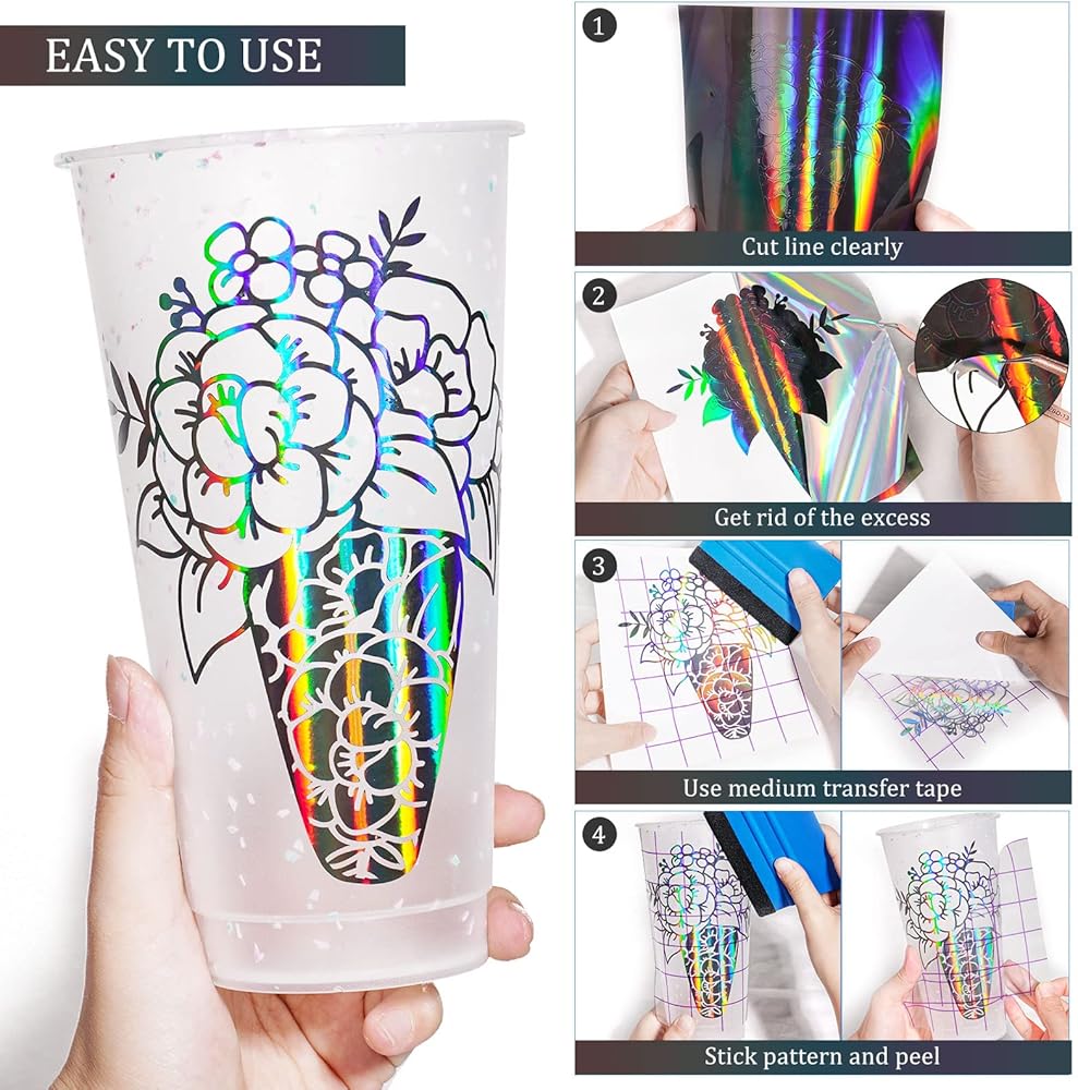 ✔️عبوة رول فينيل هولوغرافية ممتازة: فينيل ثلاثي الأبعاد جميل، والذي يمكن أن يعكس لون قوس قزح تحت زوايا مختلفة، والجزء الخلفي منه متلألئ بالفضة الملونة، لذلك فهو أيضًا مشروع جميل من الخلف.