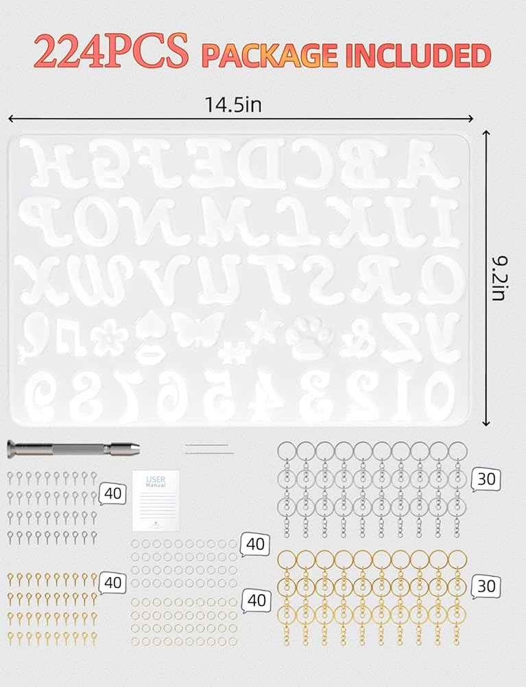 More Keyrings Included: More key rings are equipped, more finished pendants could be made. Package list: 60 key rings, 80 screw pins, 80 jump rings, 1 silicone mold, 1 hand drill and 2 sizes of drill bits. A total set of 224 pcs of this resin mold set.