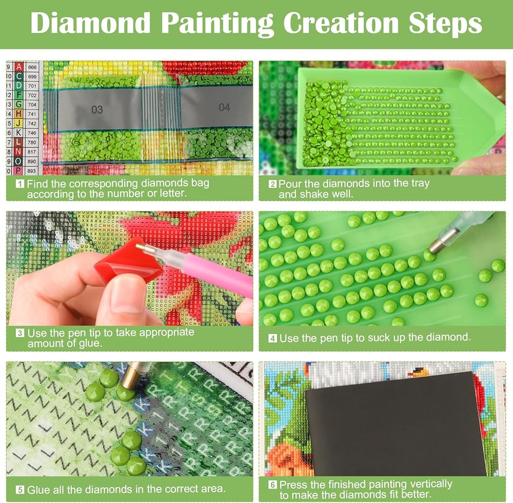 Contain All Tools - Diamond painting kits contain all tools: 1 high definition canvas, 1 diamond tray, 1 big wax, 2 diamond pens, 1 replaceable correction pen, 5 ziplock bags and enought round diamonds, so you don't need to purchase any additional tools.