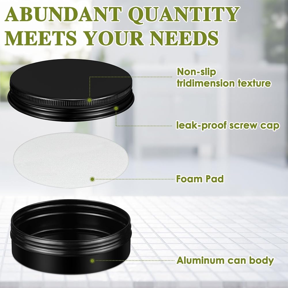 صناعة متقنة: حاويات الألومنيوم ذات الأغطية مصنوعة من علب لولبية من الألومنيوم، وهي صلبة وقوية وخفيفة الوزن؛ تم تصميم العلب بفتحات لولبية، سهلة الفتح والإغلاق؛ مع وسادة إسفنجية على الغطاء، تحمي أغراضك جيدًا