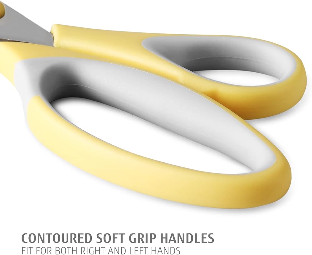 ✔ مقابض مريحة: هذه المقابض المريحة خفيفة الوزن وملفوفة بمادة البولي بروبيلين + تي ار بي ناعمة الملمس للتحكم الدقيق والراحة القصوى. المقابض الحلقية الكبيرة للمقص العالمي تناسب أي حجم لليد وتشكل بشكل جيد لكل من اليد اليمنى أو اليسرى.