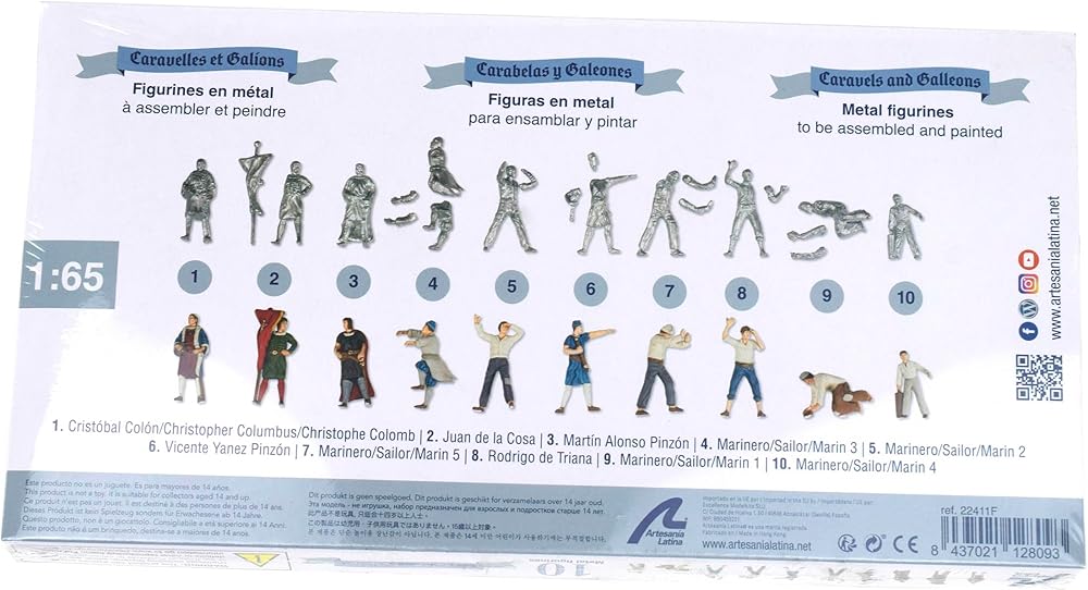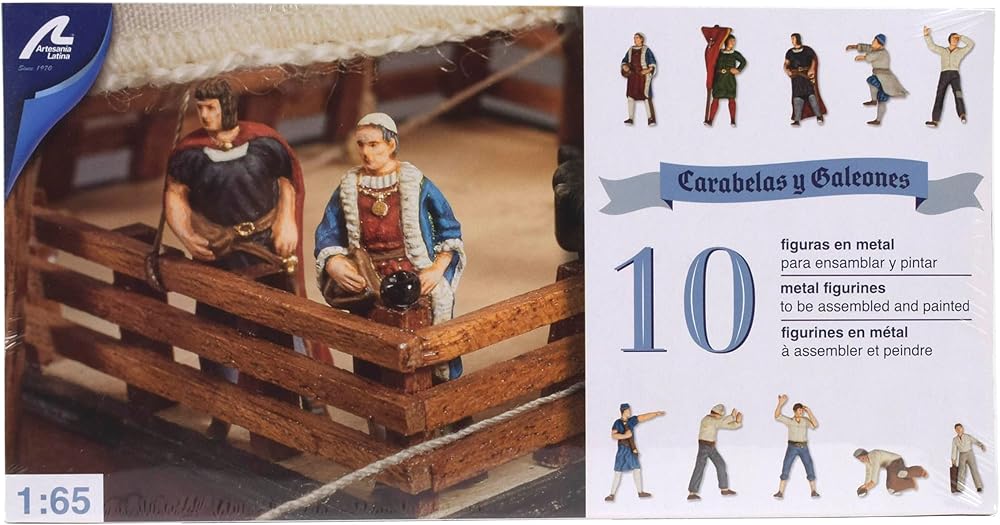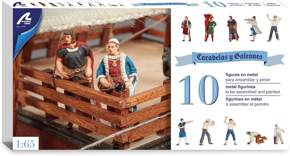 Set of 10 metal figures to assemble and paint in 1:65 scale for the model of the Santa María, for the rest of the caravels and also for galeons. Figure dimensions: from 25 to 30 mm. - Christopher Columbus - Juan de la Cosa - Martín Alonso Pinzón. - Vicente Yáñez Pinzón. - Rodrigo de Triana - Sailor 1-5. Glue and paint are not included.