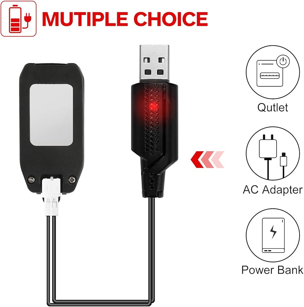 - مواصفات البطارية: سعة البطارية 3.7 فولت/300 مللي أمبير ومدة الشحن حوالي 30-45 دقيقة. مؤشر LED الأحمر يعني الشحن، وعدم وجود مؤشر LED يعني الشحن الكامل.