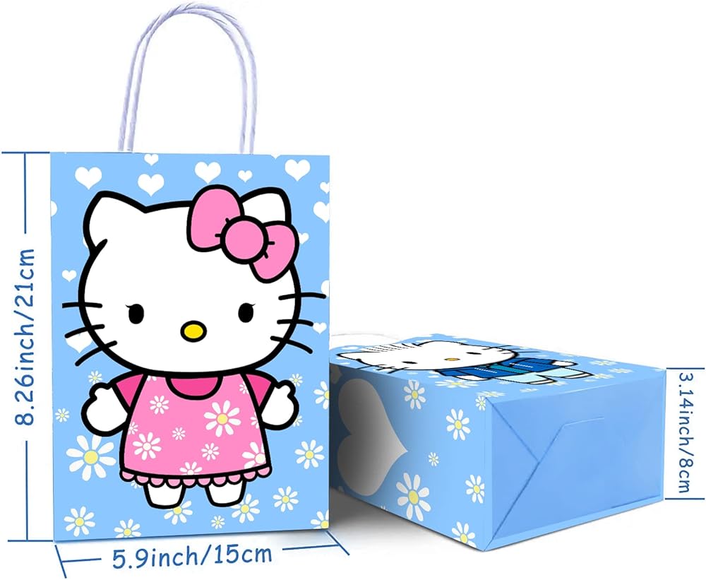 • محتوى حقائب الهدايا اللطيفة المحببة: ستحصل على 16 قطعة من أكياس الهدايا الورقية الجميلة اللطيفة مع مقابض، كل كيس وجبات خفيفة للقطط 8.3 × 5.9 × 3.1 انش/ 21 × 15 × 8 سم، حجم مناسب لتخزين هدايا الحفلات بطابع كاواي الكرتوني كيتي ميلودي والألعاب والوجبات الخفيفة والهدايا وغير ذلك الكثير