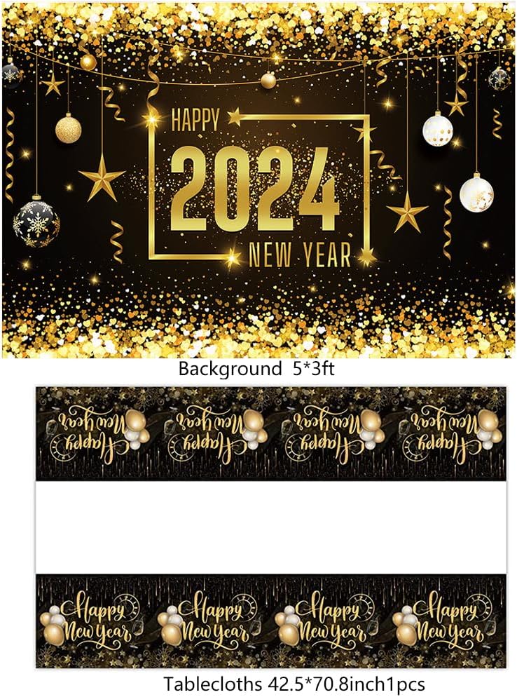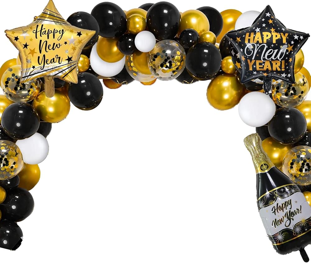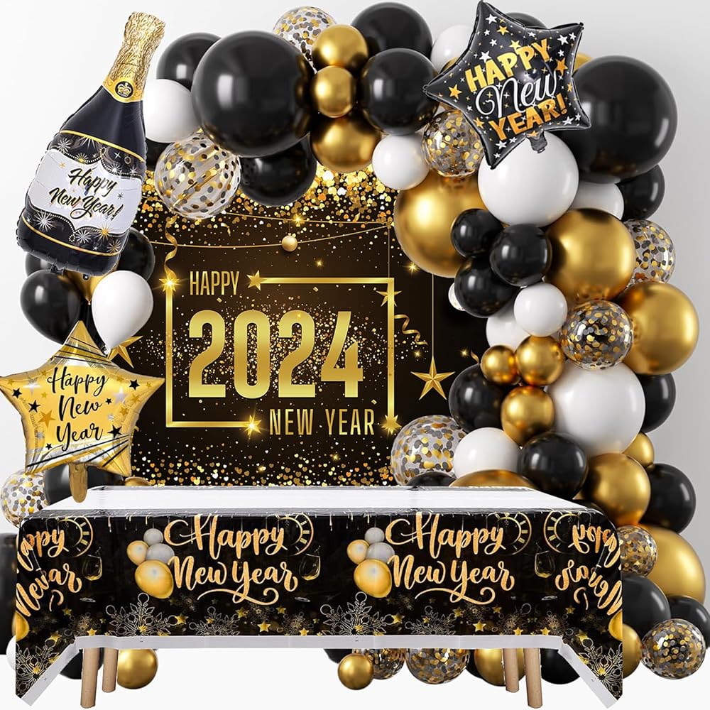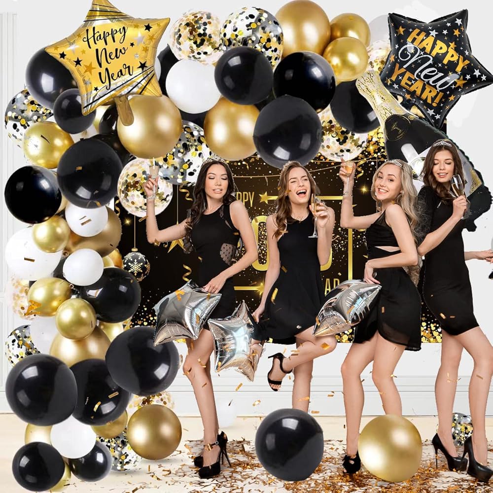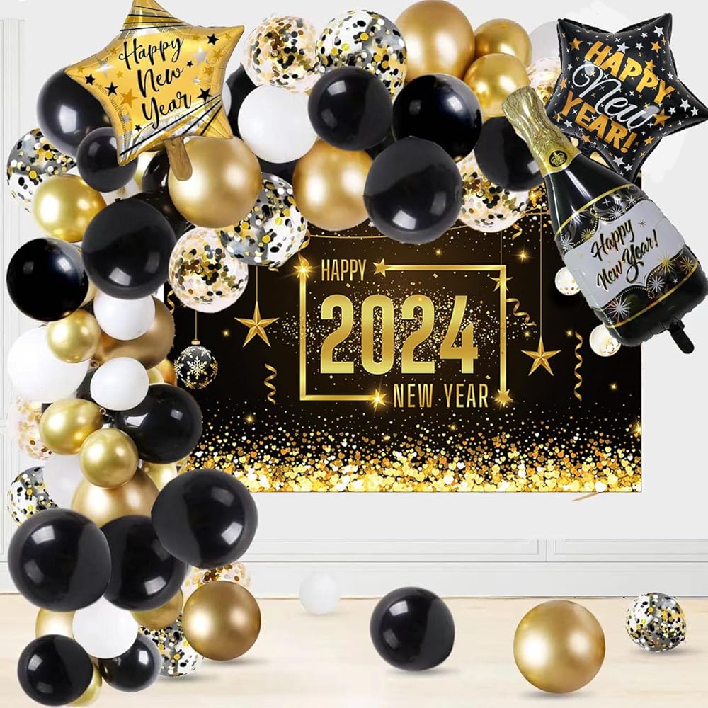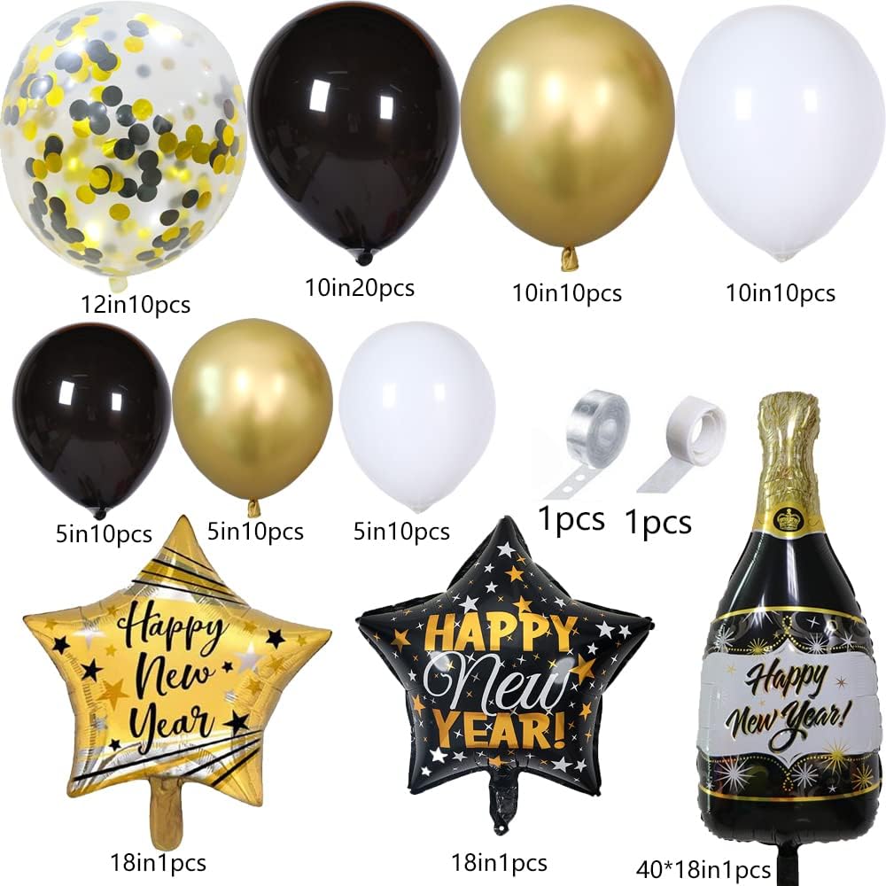 مجموعة لوازم حفلات رأس السنة الجديدة السعيدة مع 87 قطعة من بالونات السنة الجديدة على شكل قوس إكليل بالونات ليلة رأس السنة الجديدة ولافتة خلفية ولافتة مفرش طاولة لتزيين حفلات رأس السنة الجديدة