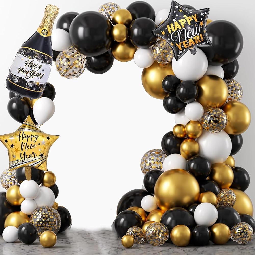 هدايا حفلة رأس السنة الجديدة: خلفية سنة جديدة سعيدة وإكليل قوس بالونات رأس السنة باللون الأسود والذهبي الجديد، تخلق جوًا سعيدًا من أجلك. مثالية لحفلات رأس السنة الجديدة وتزيين حفلات رأس السنة الجديدة والتصوير الفوتوغرافي.