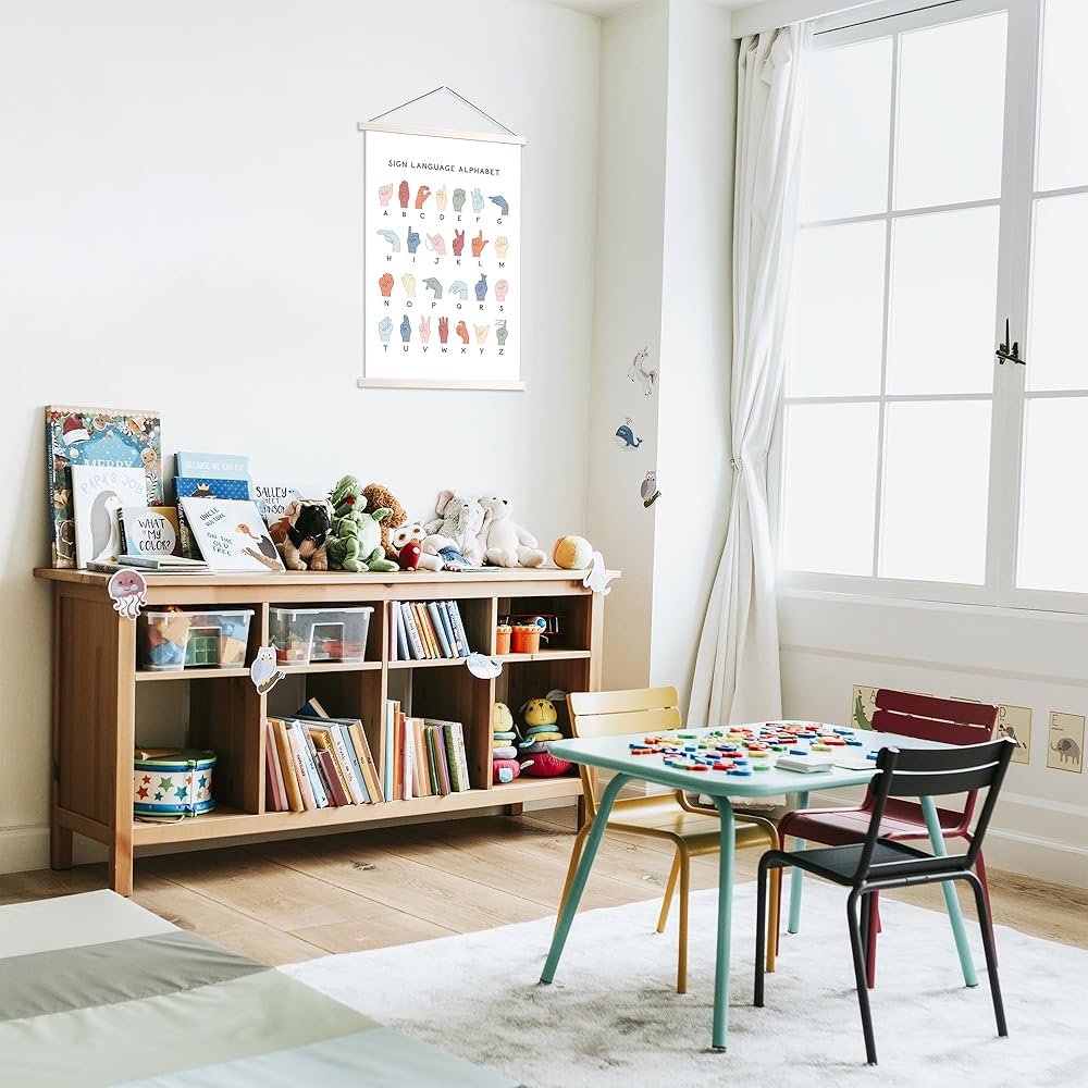 【تصميم جاهز للتعليق】: يتميز ملصق لغة الإشارة للأطفال بهيكل بسيط مع حبل قنب متصل بالعصا. بمجرد إخراجها من العلبة، فهي جاهزة للتعليق على خطاف الحائط دون أي تجميع، مما يجعل التثبيت سهلاً.
