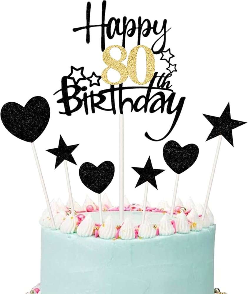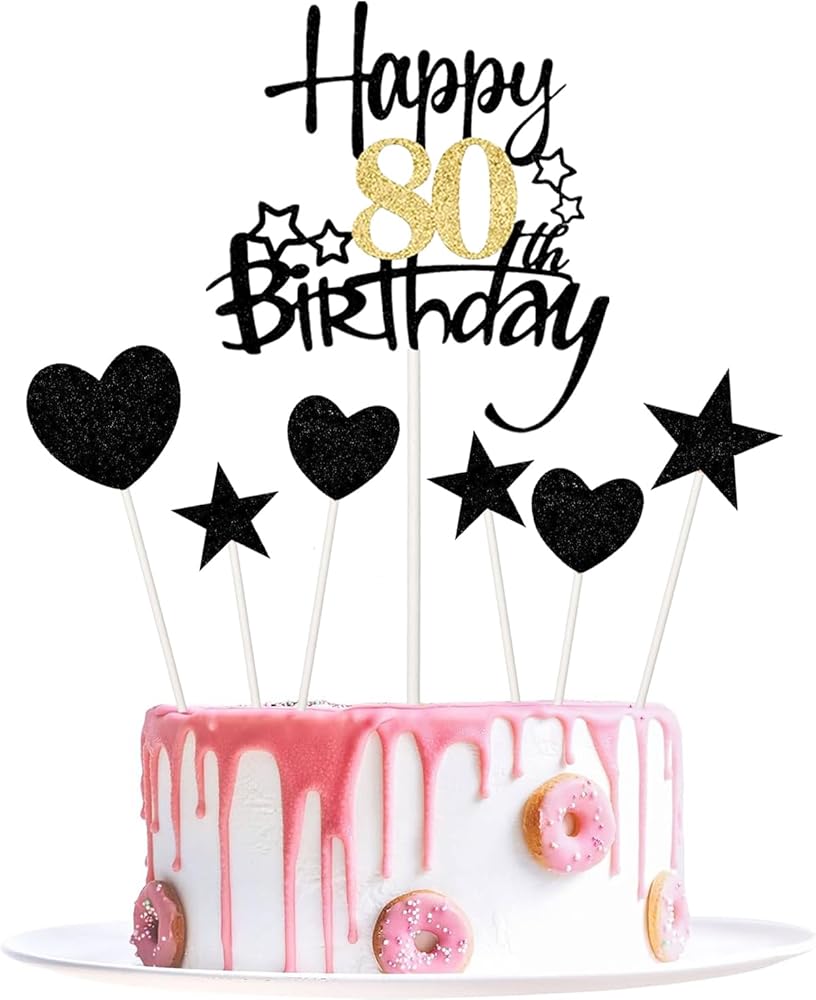 🖤【Package Includes】1pcs black gold happy 60th birthday cake topper, 3pcs black stars cake toppers, 3pcs black hearts cake toppers, 8pcs sticks, 10pcs glue. These black stars and hearts cake toppers can also be used as a cupcake topper. Size: happy 60th birthday cake topper is approx 14.5x14cm/5.7x5.5inch; big star and heart cake topper is approx 4x4cm/1.6x1.6inch, small stars and hearts cake topper is approx 3x3cm/1.2x1.2inch, the stick is approx 15cm/5.9inch, suitable for 6-10inch cakes.