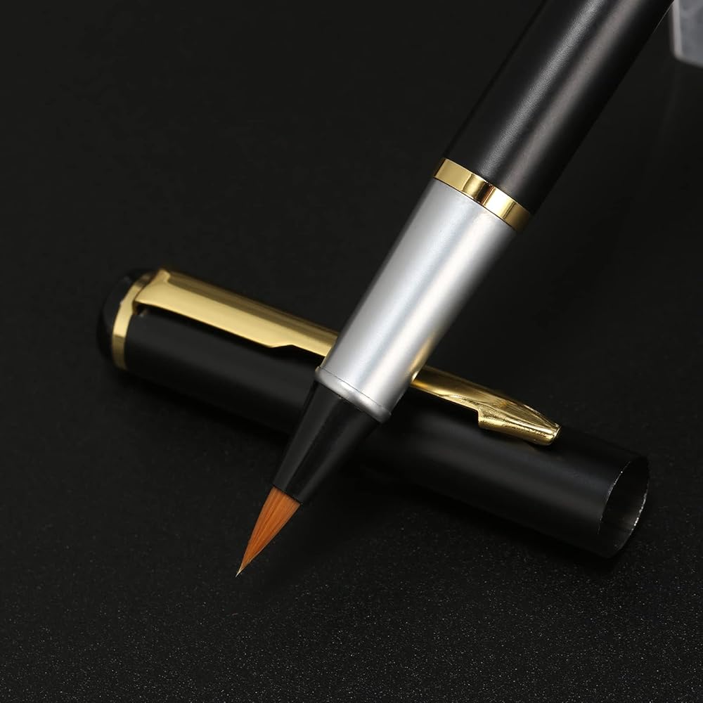 This refillable brush tip fountain pen is a combination of traditional Chinese/Japanese calligraphy brush pens and modern Fountain pens, it includes a soft natural fibre tip and black metal fountain pen body/cap, looks so classical and modern!