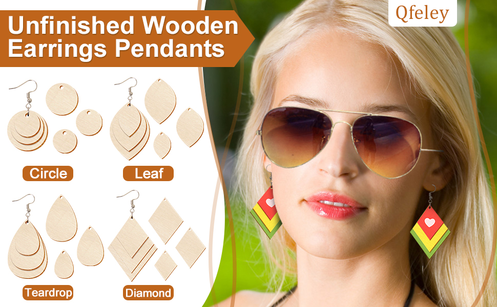 320 قطعة من الأقراط الخشبية غير المكتملة من Qfeley بفراغات خشبية على شكل دمعة / دائرة/ ورقة شجر / ألماس مع 100 قطعة خطافات قرط و100 قطعة من حلقات الوصل لصناعة المجوهرات بنفسك