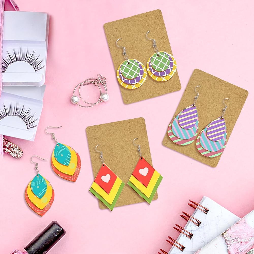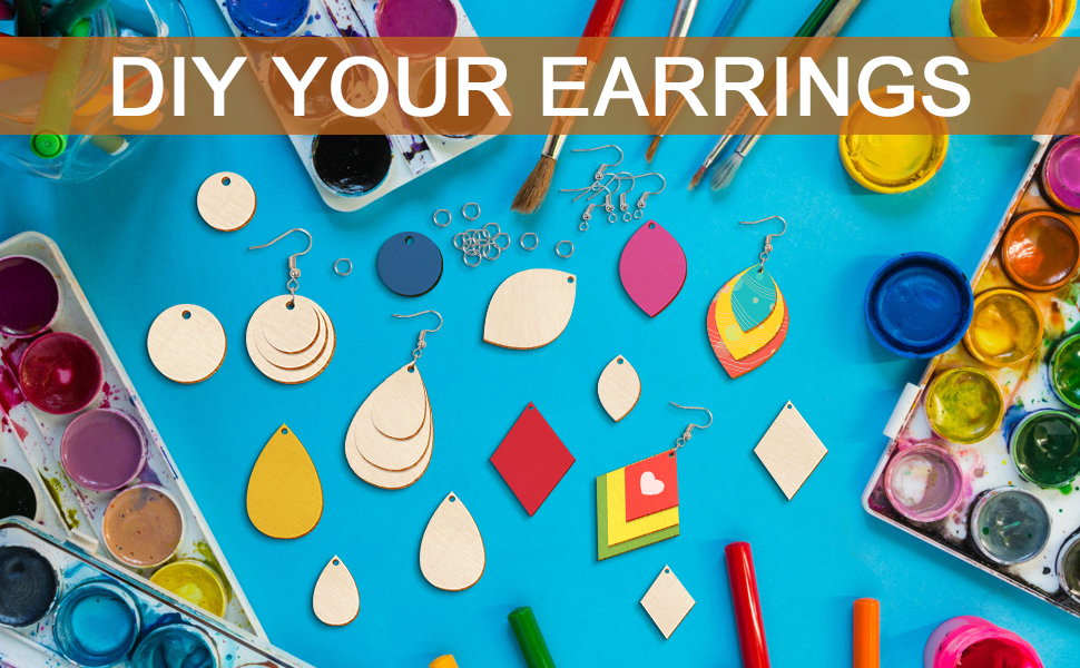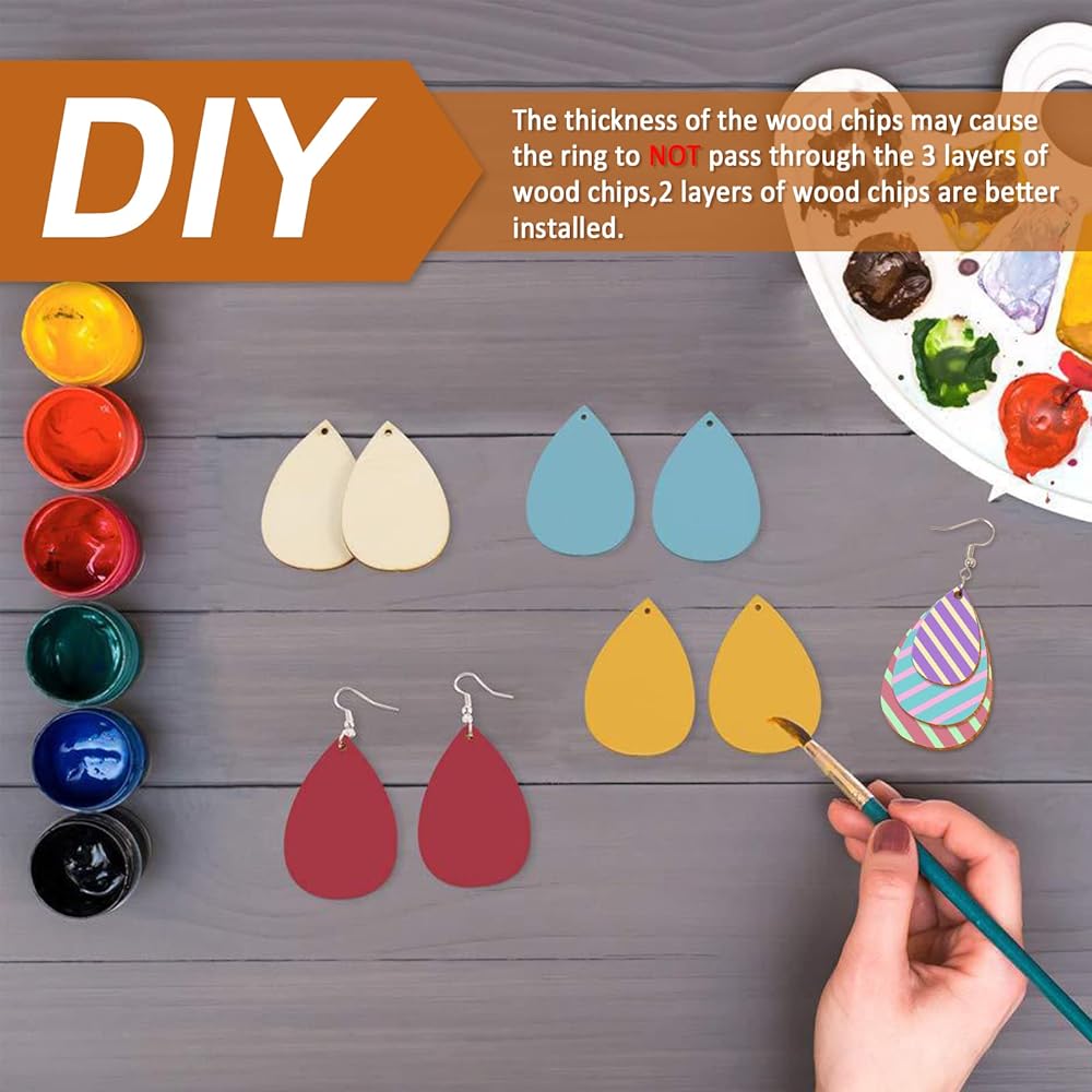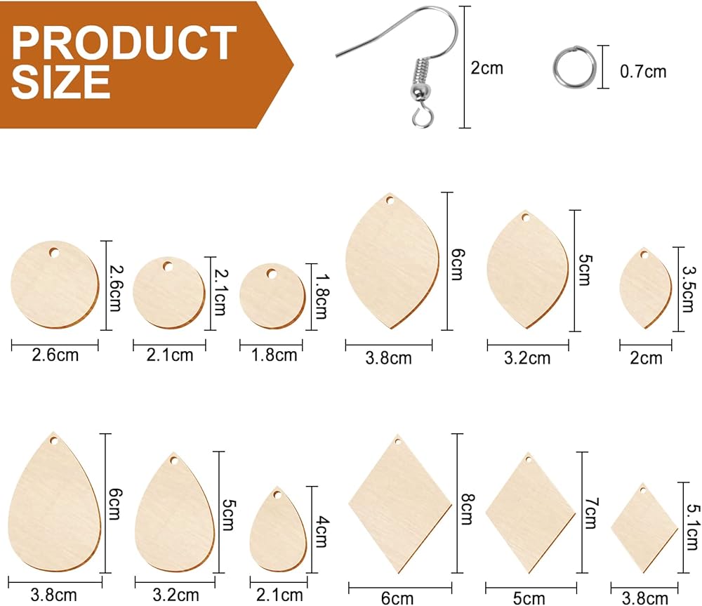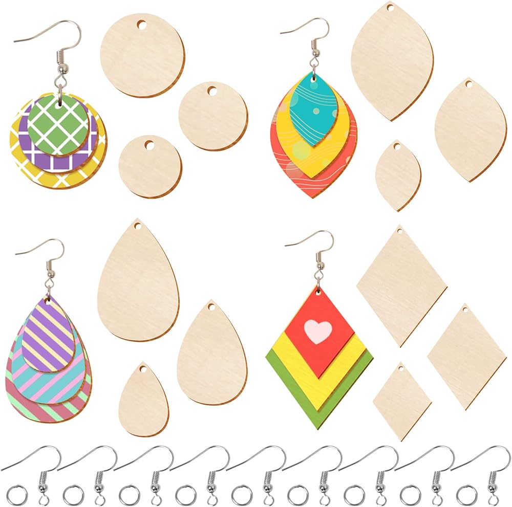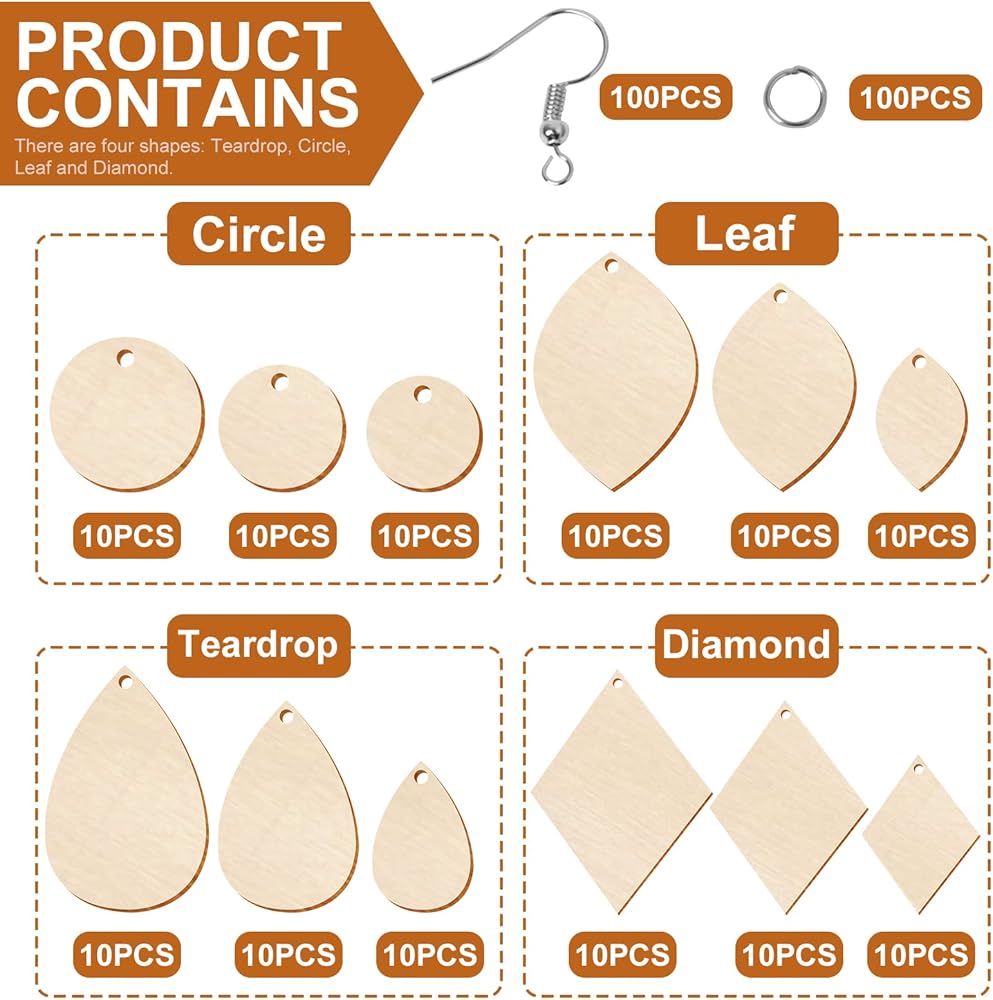 Qfeley 320 قطعة أقراط خشبية غير مكتملة الفراغات الخشبية دمعة / دائرة / أوراق / أقراط الماس المعلقات مع 100 قطعة من خطافات القرط و 100 قطعة خواتم القفز لصناعة المجوهرات
