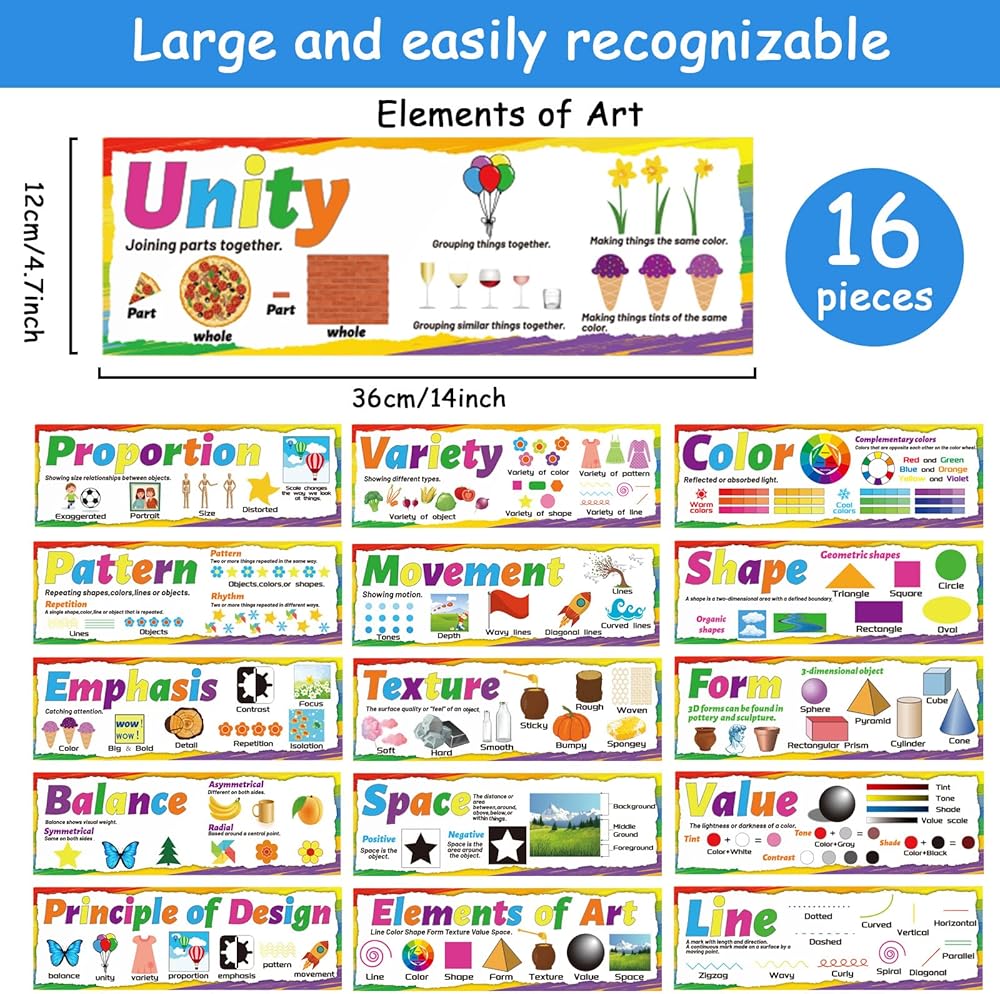 • 【ما تحصل عليه】تتضمن الملصقات الفنية 16 قطعة - 7 قطع من العناصر الفنية (الخط والشكل والملمس والمساحة واللون والشكل والقيمة) و7 قطع من مبدأ التصميم (التوازن، التنوع، التركيز، الحركة، الوحدة، النسبة، النمط). جميعها مثالية للاحتياجات التعليمية الفنية المدرسية، ديكورات غرفة الفن، أو احتياجات التعليم المنزلي. الصور الملونة المصممة جيدًا لافتة للنظر للغاية ويمكن أن تثير اهتمامات الطلاب بسهولة.